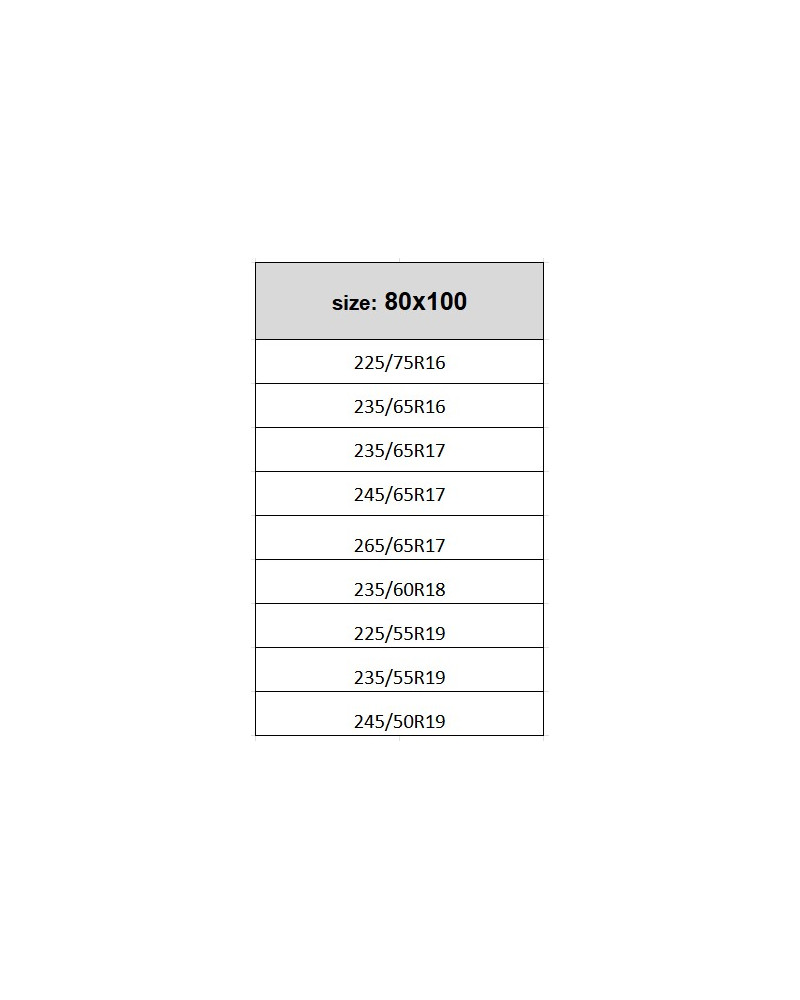 Pasuje na koła o rozmiarze: 225/75R16, 235/65R16, 235/65R17, 245/65R17, 265/65R17, 235/60R18, 225/55R19, 235/55R19, 245/50R19.
