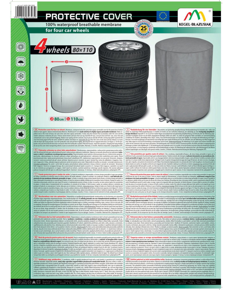 Membranowy, nieprzemakalny i jednocześnie paroprzepuszczalny pokrowiec do ochrony kół lub opon samochodowych przed niekorzystnym wpływem środowiska. Odporny na warunki atmosferyczne pokrowiec wykonany w całości z membrany wysokoparoprzepuszczalnej. Nieprzemakalny nawet podczas intensywnego deszczu i jednocześnie paroprzepuszczalny, odprowadzający na zewnątrz pokrowca wilgoć gromadzącą się pod pokrowcem i substancje lotne wydzielane przez opony. Chroni przechowywane koła i opony przed promieniami słonecznym (szkodliwym UV), nadmiernym nagrzewaniem się oraz przed deszczem, śniegiem, szronem i zanieczyszczeniami jak pył i ptasie odchody. Ogranicza proces starzenie się opon i korozji felg. Łatwy do zakładania i ściągania z mocnym ściągaczem z linką, zabezpieczającym pokrowiec przed zerwaniem przez wiatr. Odpowiedni do użytku na zewnątrz i wewnątrz pomieszczeń.