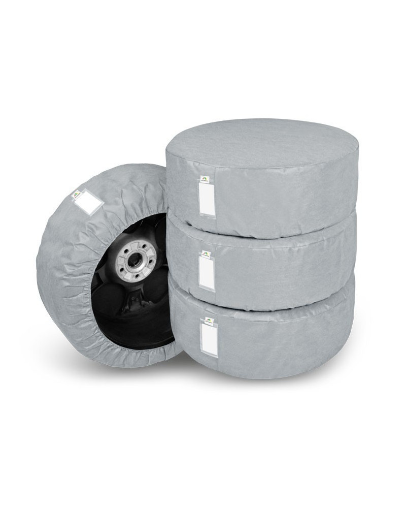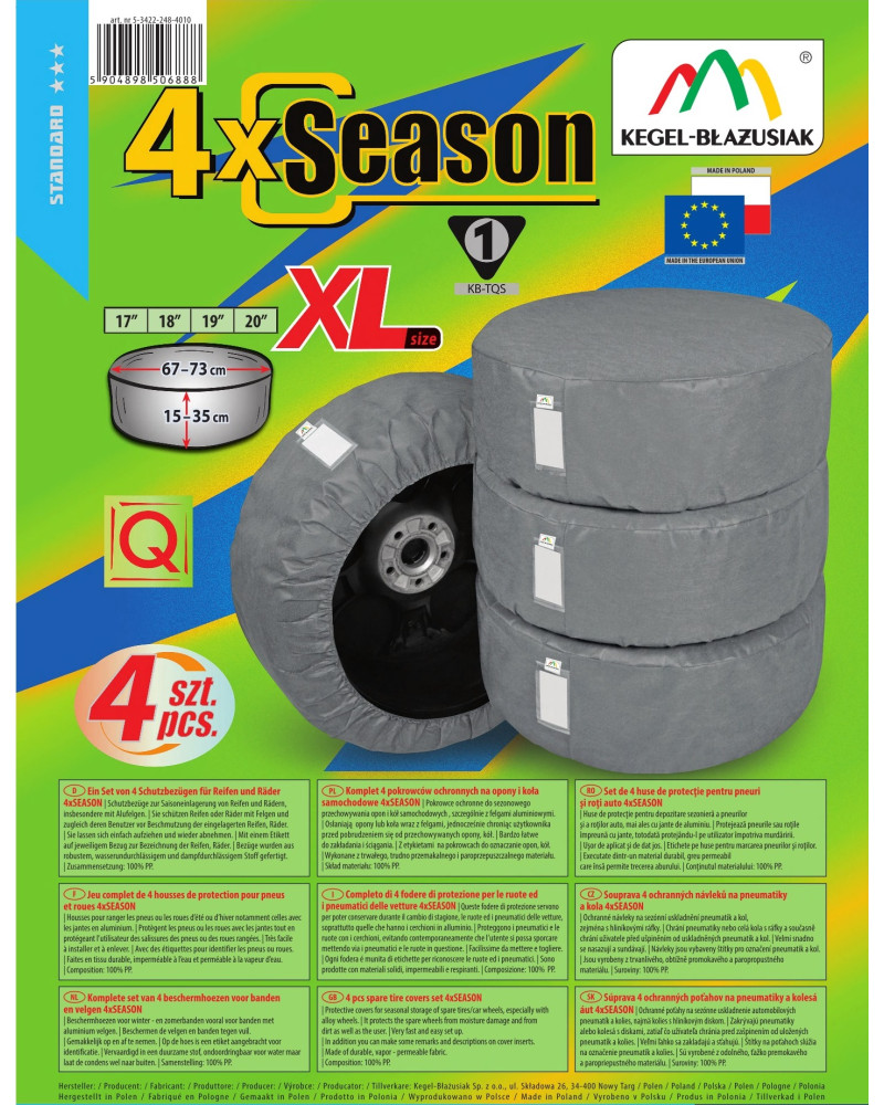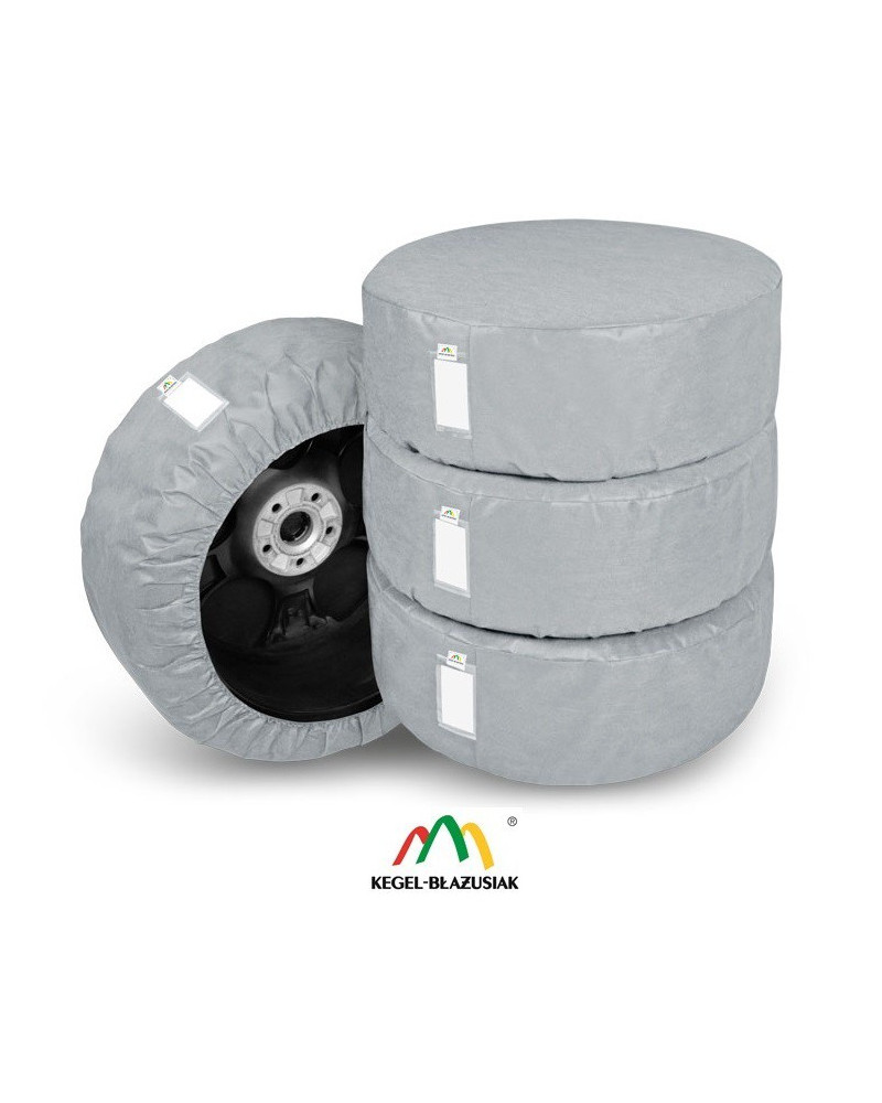 Komplet 4 wysokiej jakości pokrowców SEASON – przeznaczonych do sezonowego przechowywania opon i kół samochodowych, szczególnie tych z felgami aluminiowymi (osłaniają opony wraz z felgami). Wykonane są z trudno-przemakalnego, paroprzepuszczalnego materiału, który zapewnia prawidłowa cyrkulację powietrza wewnątrz pokrowców i zapobiega powstawianiu korozji. Bardzo dobrze prezentują się w garażu. Po ściągnięciu pokrowca, koła/opony pozostaną w stanie jakim je tam pozostawiliśmy. Nie osiądzie na nich kurz/ nie zniszczą się, nawet podczas długiej przerwy w ich używaniu. Pokrowce bardzo dobrze chronią przed zabrudzeniami odzież, w czasie przenoszenia kół. Pokrowce posiadają wszytą kieszonkę na etykietę opisową opony/koła, co jest bardzo praktyczną funkcją. Bardzo łatwo zakłada się je i zdejmuje.