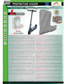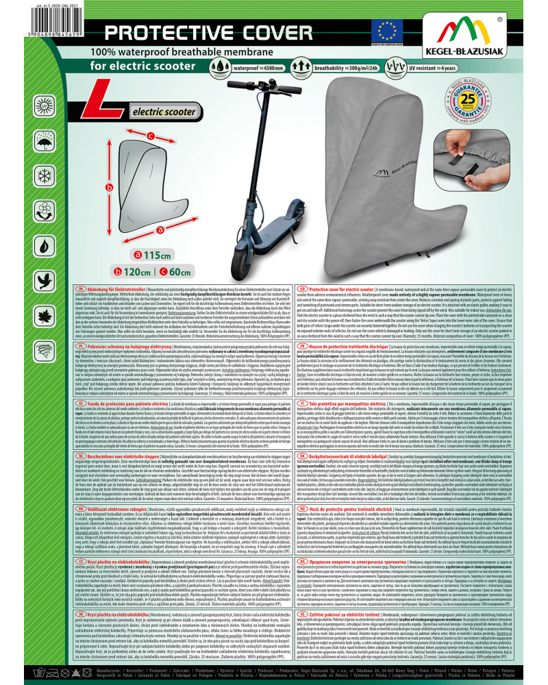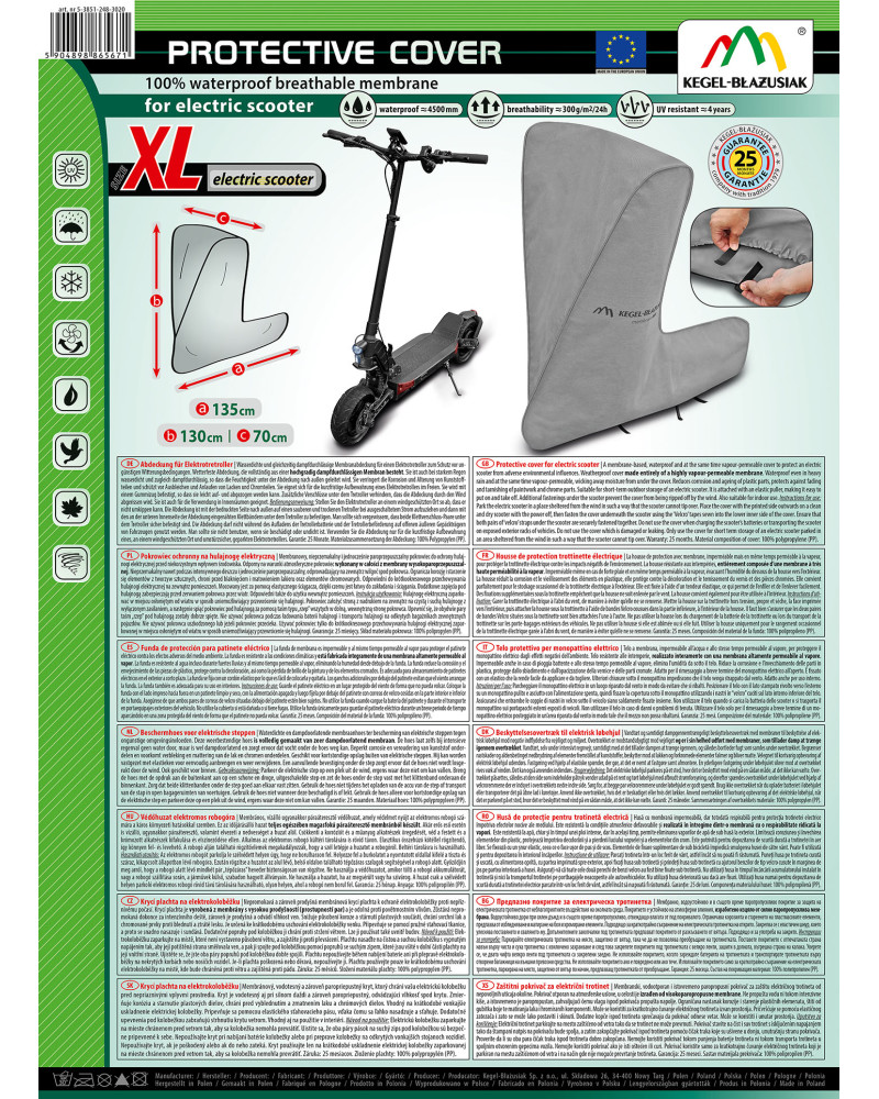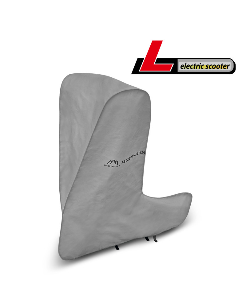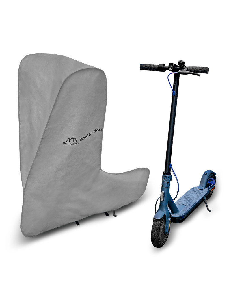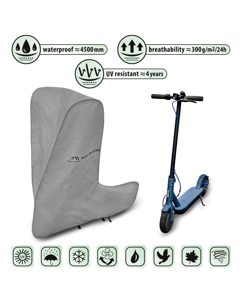 Membranowy, nieprzemakalny i jednocześnie paroprzepuszczalny pokrowiec do ochrony hulajnogi elektrycznej przed niekorzystnym wpływem środowiska. Odporny na warunki atmosferyczne pokrowiec wykonany w całości z membrany wysokoparoprzepuszczalnej. Nieprzemakalny nawet podczas intensywnego deszczu i jednocześnie paroprzepuszczalny, odprowadzający na zewnątrz wilgoć spod pokrowca. Ogranicza korozję i starzenie się elementów z tworzyw sztucznych, chroni przed blaknięciem i matowieniem lakieru oraz elementów chromowanych. Odpowiedni do krótkookresowego przechowywania hulajnogi elektrycznej na zewnątrz pomieszczeń. Mocowany jest za pomocą elastycznego ściągacza, dzięki czemu jest łatwy do zakładania i ściągania. Dodatkowe zapięcia pod hulajnogą zabezpieczają przed zerwaniem pokrowca przez wiatr. Odpowiedni także do użytku wewnątrz pomieszczeń.
