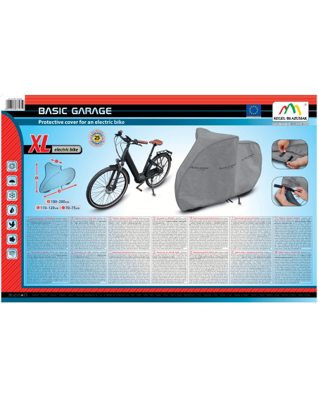 Membranowy, nieprzemakalny i jednocześnie paroprzepuszczalny pokrowiec do ochrony roweru elektrycznego przed niekorzystnym wpływem środowiska. Odporny na warunki atmosferyczne pokrowiec wykonany w całości z membrany wysokoparoprzepuszczalnej. Nieprzemakalny nawet podczas intensywnego deszczu i jednocześnie paroprzepuszczalny, odprowadzający na zewnątrz wilgoć spod pokrowca. Ogranicza korozję i starzenie się elementów z tworzyw sztucznych, chroni przed blaknięciem i matowieniem lakieru oraz elementów chromowanych. Odpowiedni do krótkookresowego przechowywania roweru na zewnątrz pomieszczeń. Mocowany jest za pomocą elastycznego ściągacza, dzięki czemu jest łatwy do zakładania i ściągania. Dodatkowe przypięcia do kół i zapięcie pod rowerem zabezpieczają przed zerwaniem pokrowca przez wiatr. Odpowiedni także do użytku wewnątrz pomieszczeń i do ochrony roweru bez napędu elektrycznego.