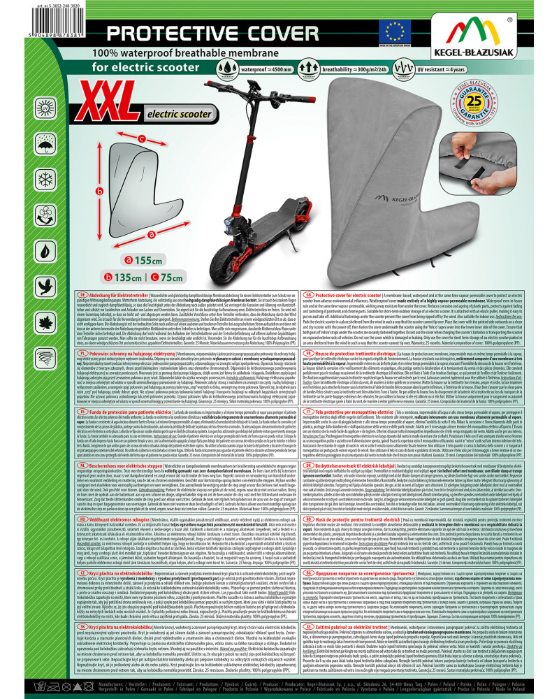 Membranowy, nieprzemakalny i jednocześnie paroprzepuszczalny pokrowiec do ochrony hulajnogi elektrycznej przed niekorzystnym wpływem środowiska. Odporny na warunki atmosferyczne pokrowiec wykonany w całości z membrany wysokoparoprzepuszczalnej. Nieprzemakalny nawet podczas intensywnego deszczu i jednocześnie paroprzepuszczalny, odprowadzający na zewnątrz wilgoć spod pokrowca. Ogranicza korozję i starzenie się elementów z tworzyw sztucznych, chroni przed blaknięciem i matowieniem lakieru oraz elementów chromowanych. Odpowiedni do krótkookresowego przechowywania hulajnogi elektrycznej na zewnątrz pomieszczeń. Mocowany jest za pomocą elastycznego ściągacza, dzięki czemu jest łatwy do zakładania i ściągania. Dodatkowe zapięcia pod hulajnogą zabezpieczają przed zerwaniem pokrowca przez wiatr. Odpowiedni także do użytku wewnątrz pomieszczeń.