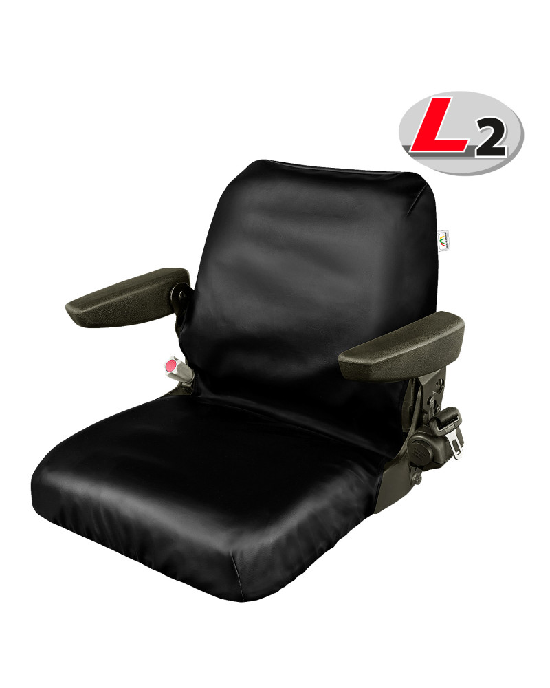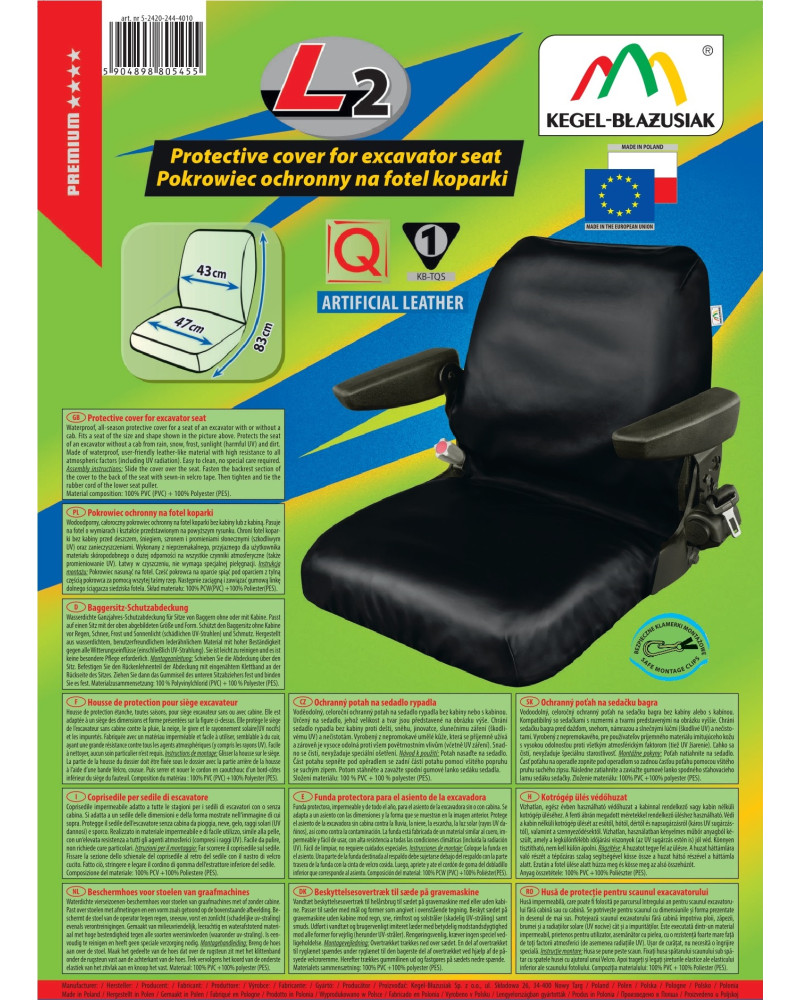 Wodoodporny, całoroczny pokrowiec ochronny na fotel koparki bez kabiny lub z kabiną. Pasuje na fotel o wymiarach i kształcie przedstawionym na powyższym rysunku. Chroni fotel koparki bez kabiny przed deszczem, śniegiem, szronem i promieniami słonecznymi (szkodliwym UV) oraz zanieczyszczeniami. Wykonany z nieprzemakalnego, przyjaznego dla użytkownika materiału skóropodobnego o dużej odporności na wszystkie czynniki atmosferyczne (także promieniowanie UV). Łatwy w czyszczeniu, nie wymaga specjalnej pielęgnacji.