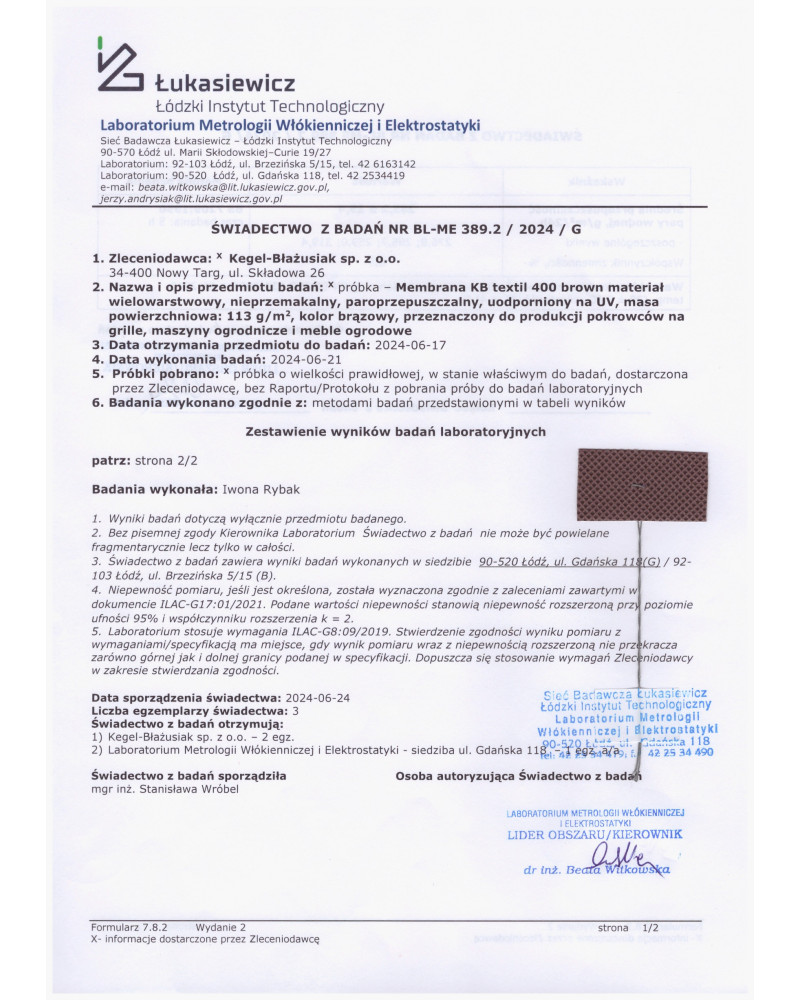 Poniżej raport z badań paroprzepuszczalności membrany z której produkujemy pokrowce Optimal Garage. Badania zostały wykonane w