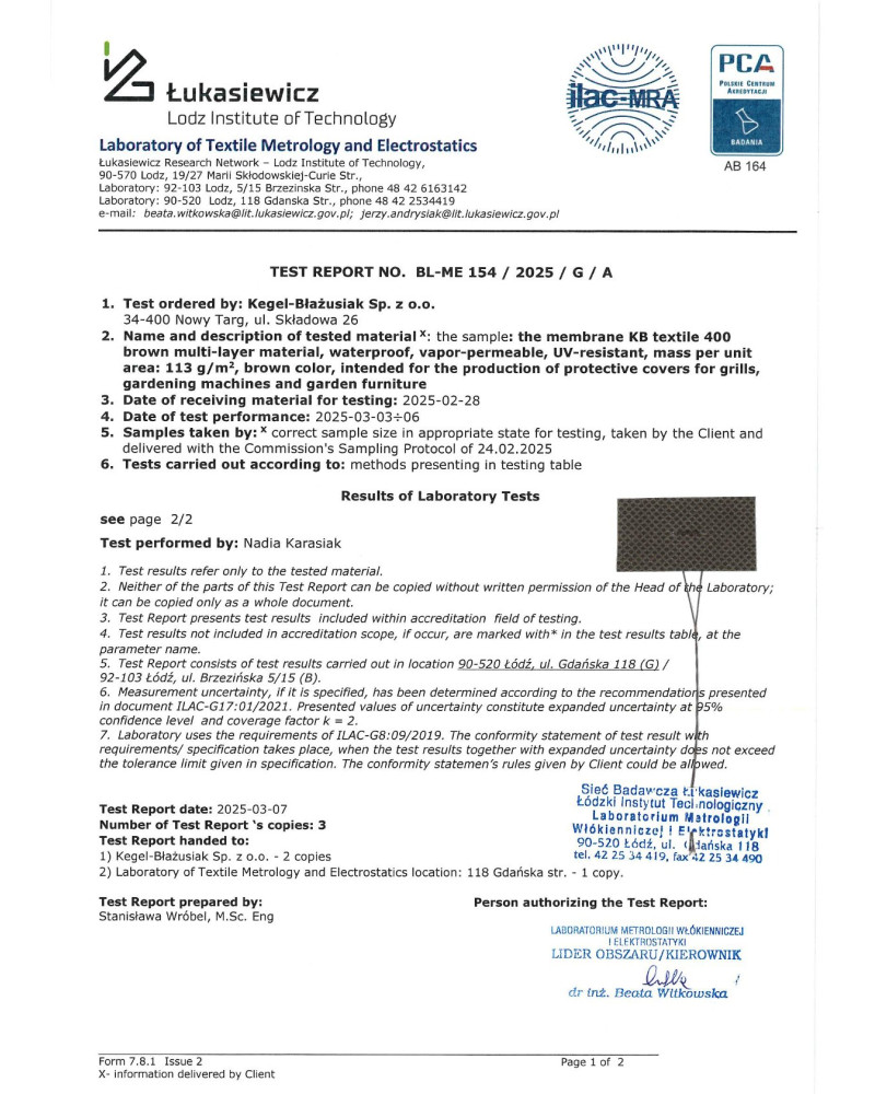 Poniżej raport z badań paroprzepuszczalności membrany z której produkujemy pokrowce Optimal Garage. Badania zostały wykonane w