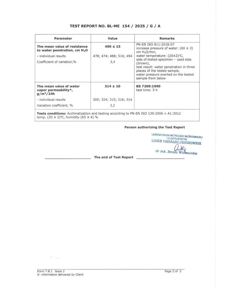 niezależnym, akredytowanym laboratorium badawczym. Badanie potwierdza wysoką paroprzepuszczalność membrany i przenikanie pary wodnej przez membranę pokrowca na poziome 314 gramów pary wodnej przez m2 membrany w ciągu 24 godzin.