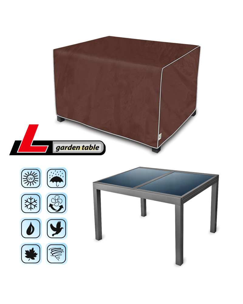 Całoroczny pokrowiec do ochrony stołu ogrodowego przechowywanego na zewnątrz przed niekorzystnym wpływem środowiska. Dzięki specjalnej konstrukcji woda podczas deszczu spływa po pokrowcu nie wnikając pod pokrowiec. Chroni stół przed deszczem, śniegiem, szronem i promieniami słonecznymi (szkodliwym UV) oraz zanieczyszczeniami jak pył, ptasie odchody i soki z drzew. Ogranicza korozję i starzenie się elementów z tworzyw sztucznych lub drewna, chroni przed blaknięciem i matowieniem lakieru oraz elementów chromowanych. Pokrowiec jest w pełni odporny na wszystkie warunki atmosferyczne. Łatwy do zakładania i ściągania. Dodatkowe zapięcia zabezpieczają przed zerwaniem pokrowca przez wiatr. Odpowiedni także do użytku wewnątrz pomieszczeń.