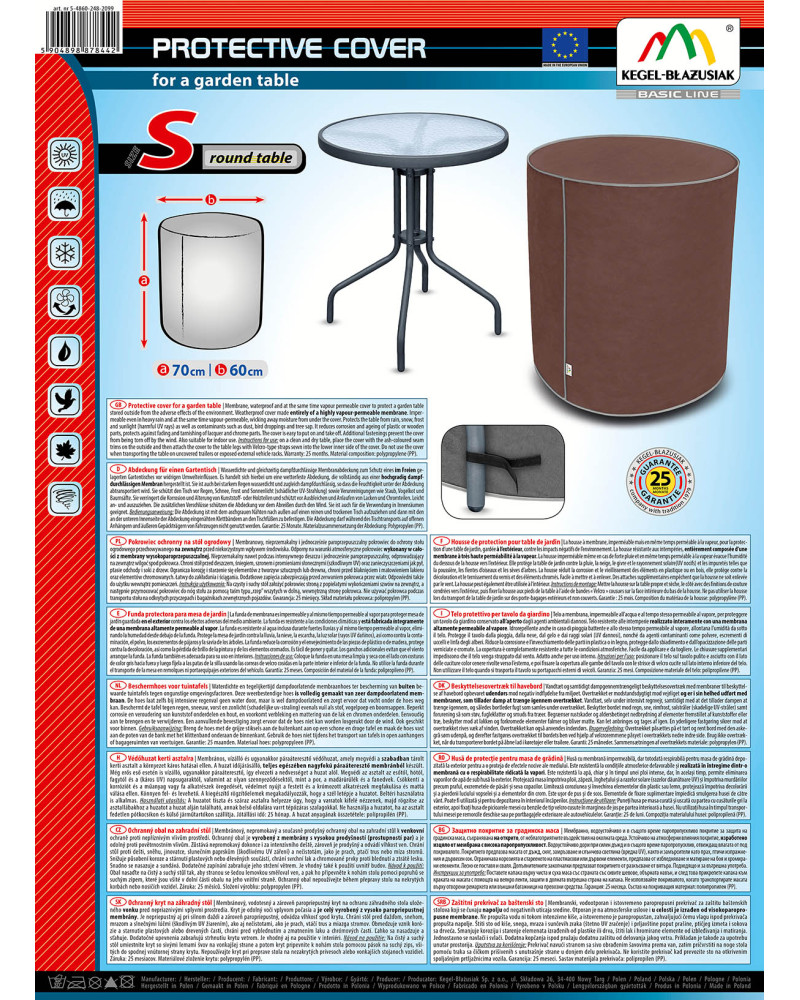 Całoroczny pokrowiec do ochrony stołu ogrodowego przechowywanego na zewnątrz przed niekorzystnym wpływem środowiska. Dzięki specjalnej konstrukcji woda podczas deszczu spływa po pokrowcu nie wnikając pod pokrowiec. Chroni stół przed deszczem, śniegiem, szronem i promieniami słonecznymi (szkodliwym UV) oraz zanieczyszczeniami jak pył, ptasie odchody i soki z drzew. Ogranicza korozję i starzenie się elementów z tworzyw sztucznych lub drewna, chroni przed blaknięciem i matowieniem lakieru oraz elementów chromowanych. Pokrowiec jest w pełni odporny na wszystkie warunki atmosferyczne. Łatwy do zakładania i ściągania. Dodatkowe zapięcia zabezpieczają przed zerwaniem pokrowca przez wiatr. Odpowiedni także do użytku wewnątrz pomieszczeń.
