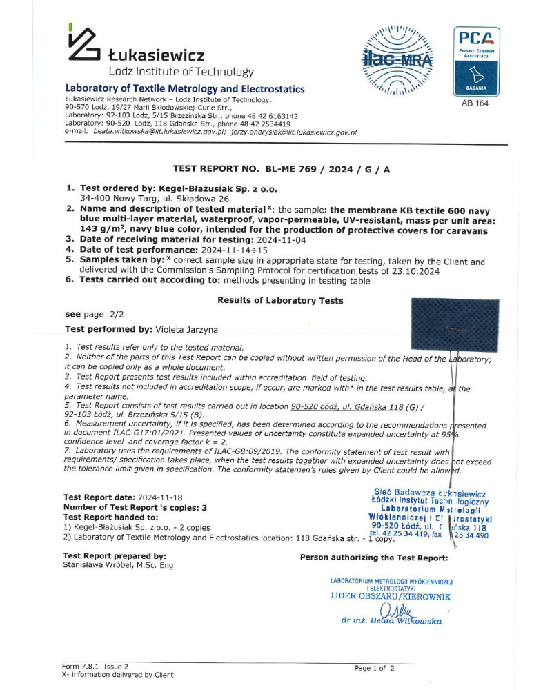 Poniżej raport z badań paroprzepuszczalności membrany z której produkujemy pokrowce Membrane Garage. Badanie zostało wykonane w niezależnym labortorium badawczym. Badanie potwierdza wysoką paroprzepuszczalność i wodoszczelność membrany: przenikanie pary wodnej przez membranę pokrowca 359 gramy pary wodnej przez m² membrany w ciągu 24 godzin, wodoszczelność membrany 3410 mm słupa wody.
