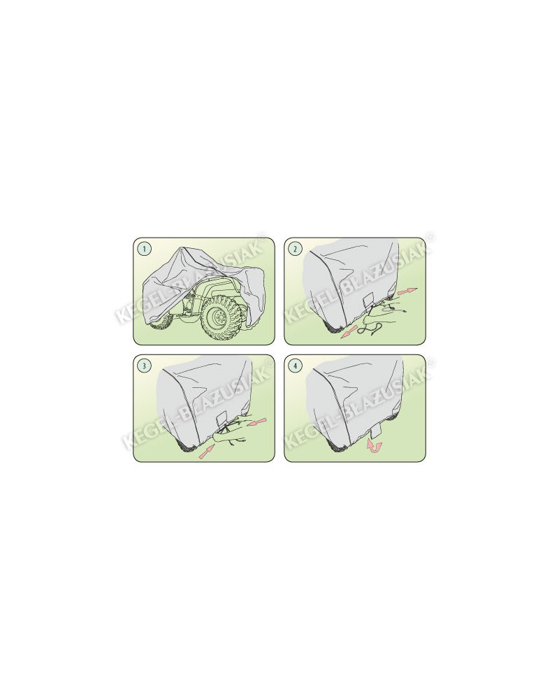 Pokrowiec założyć na czysty quad czarną stroną pasa pokrowca od wewnątrz. Następnie maksymalnie mocno zaciagnąć linkę ściągacza pokrowca i pewnie ją zawiązać.