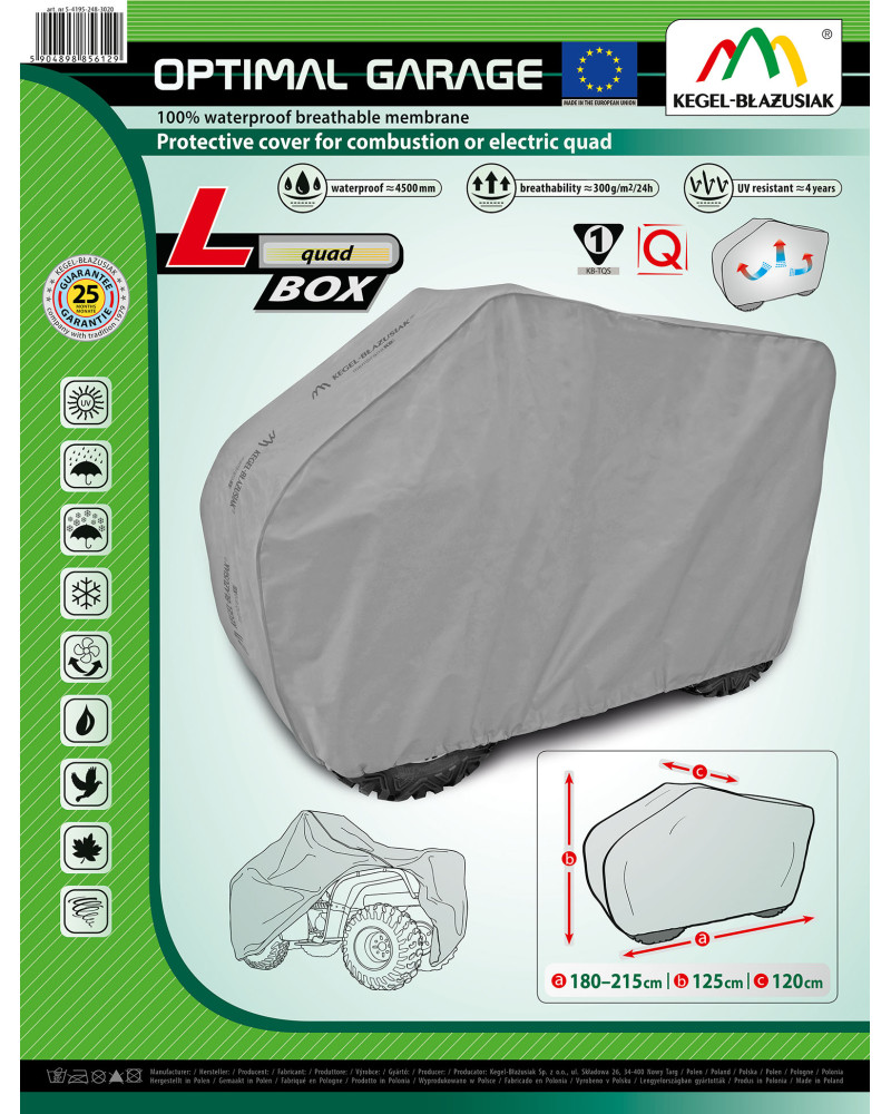 Membranowy, nieprzemakalny i jednocześnie paroprzepuszczalny pokrowiec na quad. Materiał zachowuje niemalże całkowitą szczelność, przy jednoczesnym zapewnieniu odpowiedniego przepływu powietrza, umożliwiającego odprowadzanie wilgoci, gromadzącej się pod pokrowcem a w konsekwencji przeciwdziała powstawaniu korozji. Pokrowce ochronią cały quad wraz z jego dolną częścią przed szkodliwym wpływem środowiska. Są odporne na działanie promieni UV. Mocowane za pomocą ściągacza z linką wokół całego pojazdu, prawidłowo zawiązane, zapewniają bezpieczeństwo nawet podczas porywistego wiatru. Dzięki dużej gamie kształtów i rozmiarów, pokrowce są dobrze dopasowane do różnych rodzajów i wielkości quadów. Udzielana na 25 miesięcy gwarancja da Ci pewność, że kupujesz produkt najwyższej jakości.