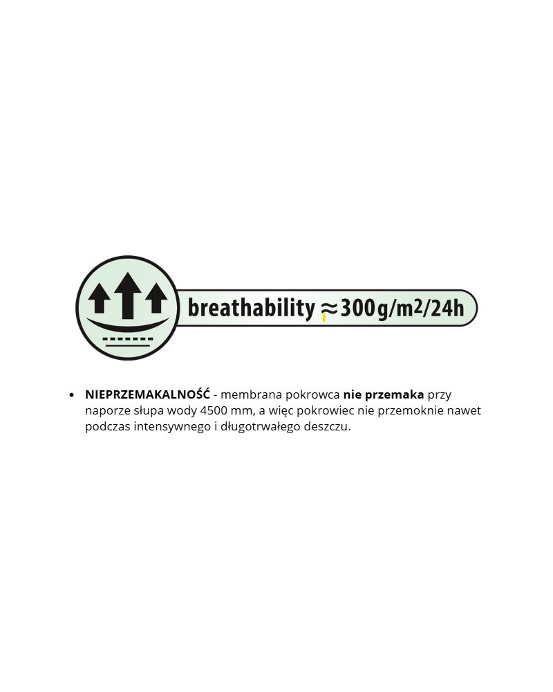 nieprzemakalny nawet podczas intensywnego deszczu i jednocześnie paroprzepuszczalny, odprowadzający na zewnątrz wilgoć spod pokrowca
