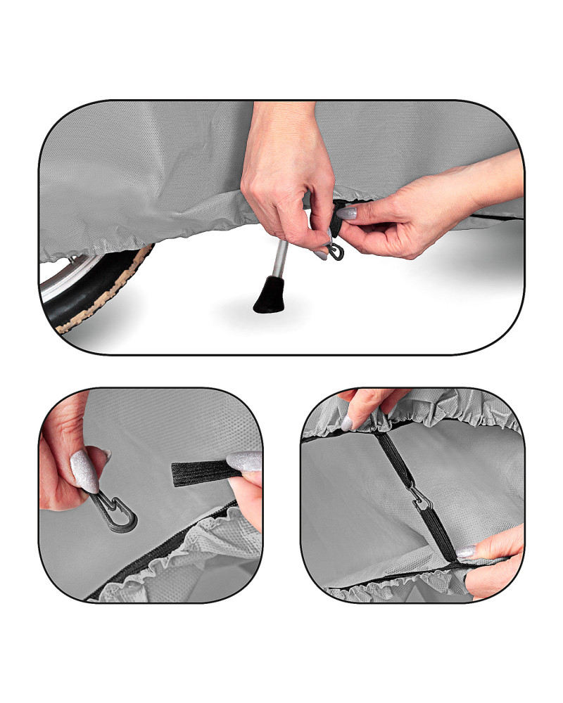Rower zaparkować w miejscu osłoniętym od wiatru w sposób uniemożliwiający przewrócenie się roweru. Pokrowiec założyć stroną z nadrukiem na zewnątrz na czysty i suchy rower, a następnie za pomocą dołączonego haczyka spiąć pętle mocujące pokrowca pod ramą roweru. Nie używać pokrowca podczas transportu roweru na odkrytych bagażnikach (platformach) zewnętrznych pojazdów.
