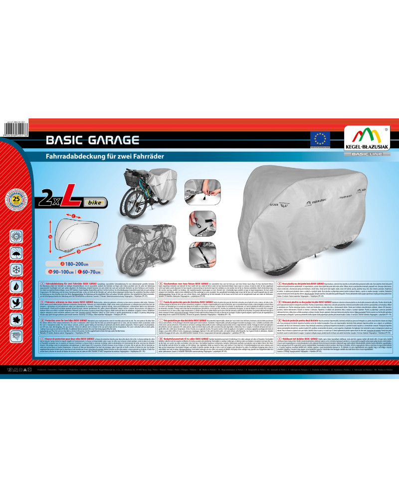 Rowery zaparkować w miejscu osłoniętym od wiatru w sposób uniemożliwiający przewrócenie się rowerów. Pokrowiec założyć stroną z nadrukiem na zewnątrz na czyste i suche rowery, a następnie za pomocą dołączonego haczyka spiąć pętle mocujące pokrowca pod ramą roweru. Nie używać pokrowca podczas transportu rowerów na odkrytych bagażnikach (platformach) zewnętrznych pojazdów.