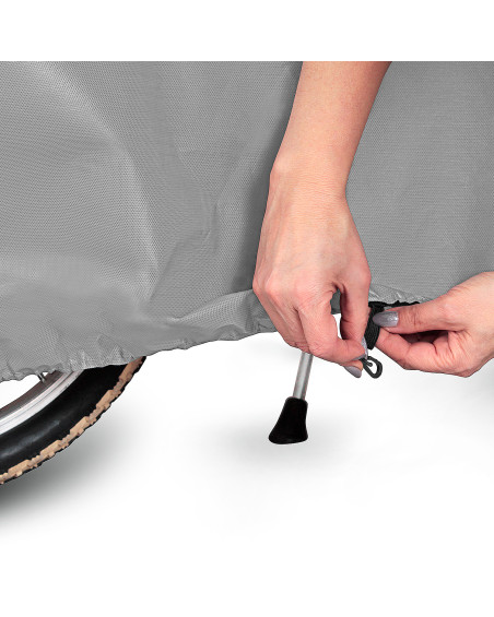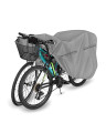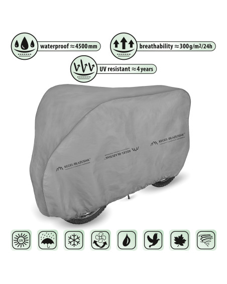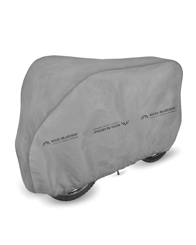 Membranowy, nieprzemakalny i jednocześnie paroprzepuszczalny pokrowiec do ochrony rowerów przechowywanych na zewnątrz przed niekorzystnym wpływem środowiska. Odporny na warunki atmosferyczne pokrowiec wykonany w całości z membrany wysokoparoprzepuszczalnej. Nieprzemakalny nawet podczas intensywnego deszczu i jednocześnie paroprzepuszczalny, odprowadzający na zewnątrz wilgoć spod pokrowca. Ogranicza korozję i starzenie się elementów z tworzyw sztucznych, chroni przed blaknięciem i matowieniem lakieru oraz elementów chromowanych. Mocowany jest za pomocą elastycznego ściągacza, dzięki czemu jest łatwy do zakładania i ściągania. Dodatkowe zapięcie pod rowerem zabezpiecza przed zerwaniem pokrowca przez wiatr. Odpowiedni do długo lub krótkookresowego przechowywania na zewnątrz pomieszczeń roweru bez napędu elektrycznego. Odpowiedni także do użytku wewnątrz pomieszczeń.