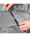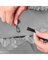 Pokrowiec założyć na czyste rowery w sposób zaprezentowany na zdjęciu. Za pomocą dołączonego haczyka spiąć pętle mocujące pokrowca pod ramami rowerów.