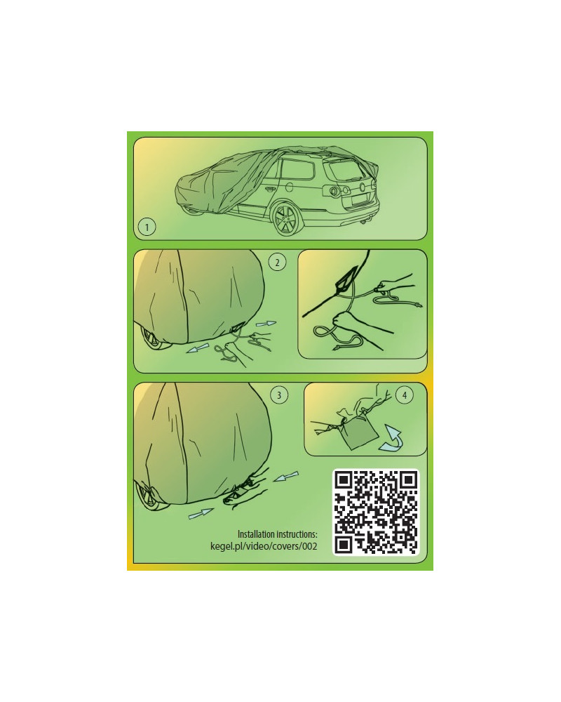 Przed założeniem pokrowca na samochód złożyć boczne lusterka oraz złożyć lub odkręcić antenę. Pokrowiec założyć na czysty i suchy samochód stroną z nadrukiem na zewnątrz. Dla ułatwienia prawidłowego ułożenia pokrowca na samochodzie w pokrowiec wszyta jest wszywka FRONT z przodu pokrowca i REAR z tyłu pokrowca (oznaczenie pokrywają się z przodem i tyłem samochodu).