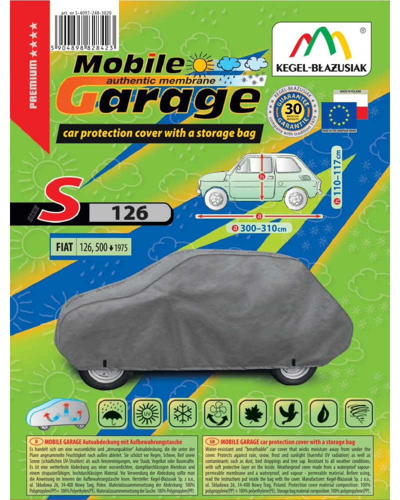 Wysokogatunkowy pokrowiec Mobile Garage to produkt dopasowany do potrzeb kierowców. Pokrowiec wykonany jest z aż 4-warstwowego materiału, który jest gruby, mocny i wytrzymały. Pokrowiec chroni cały samochód przed szkodliwym wpływem środowiska. Pokrowiec Mobile Garage to odpowiednia ochrona pojazdu przez cały rok. Jego funkcjonalność docenić można w każdej porze roku. W sezonie zimowym zapobiega osadzaniu się śniegu, szronu i lodu, a także jest odporny na przymarzanie; na jesieni chroni przed deszczem, wiatrem, liśćmi, sokami z drzew; zaś w porach letnich i wiosennych ochrania przed promieniami UV, pyłem i ptasimi odchodami.