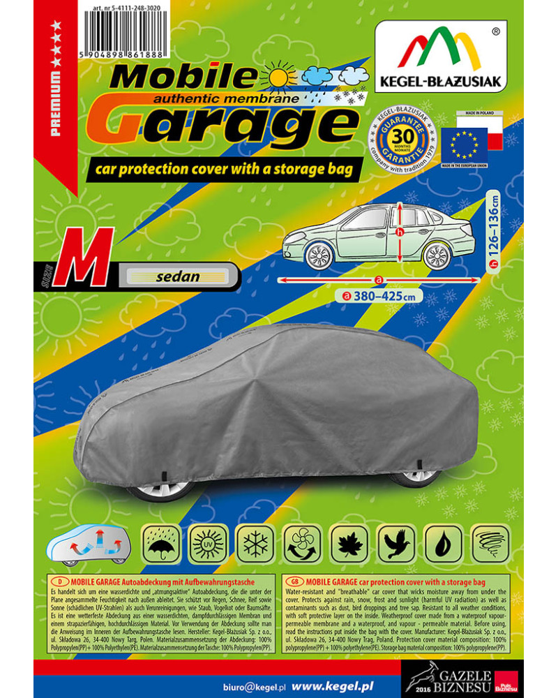 Wysokogatunkowy pokrowiec Mobile Garage to produkt dopasowany do potrzeb kierowców. Pokrowiec wykonany jest z aż 4-warstwowego materiału, który jest gruby, mocny i wytrzymały. Pokrowiec chroni cały samochód przed szkodliwym wpływem środowiska. Pokrowiec Mobile Garage to odpowiednia ochrona pojazdu przez cały rok. Jego funkcjonalność docenić można w każdej porze roku. W sezonie zimowym zapobiega osadzaniu się śniegu, szronu i lodu, a także jest odporny na przymarzanie; na jesieni chroni przed deszczem, wiatrem, liśćmi, sokami z drzew; zaś w porach letnich i wiosennych ochrania przed promieniami UV, pyłem i ptasimi odchodami.