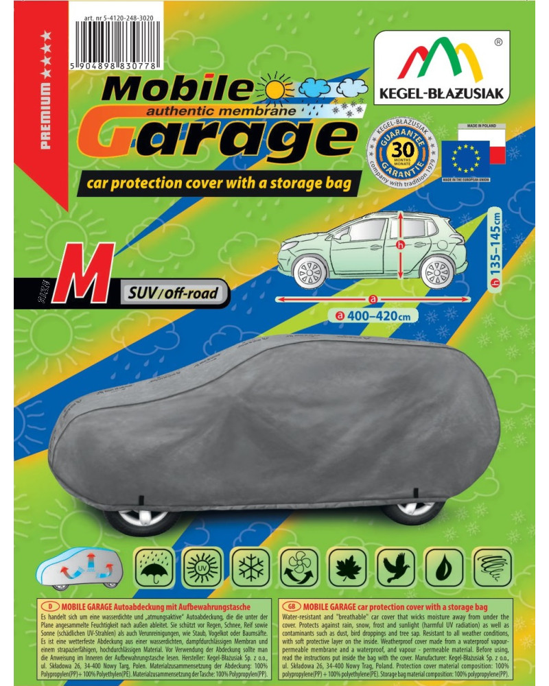 Wysokogatunkowy pokrowiec Mobile Garage to produkt dopasowany do potrzeb kierowców. Pokrowiec wykonany jest z aż 4-warstwowego materiału, który jest gruby, mocny i wytrzymały. Pokrowiec chroni cały samochód przed szkodliwym wpływem środowiska. Pokrowiec Mobile Garage to odpowiednia ochrona pojazdu przez cały rok. Jego funkcjonalność docenić można w każdej porze roku. W sezonie zimowym zapobiega osadzaniu się śniegu, szronu i lodu, a także jest odporny na przymarzanie; na jesieni chroni przed deszczem, wiatrem, liśćmi, sokami z drzew; zaś w porach letnich i wiosennych ochrania przed promieniami UV, pyłem i ptasimi odchodami.
