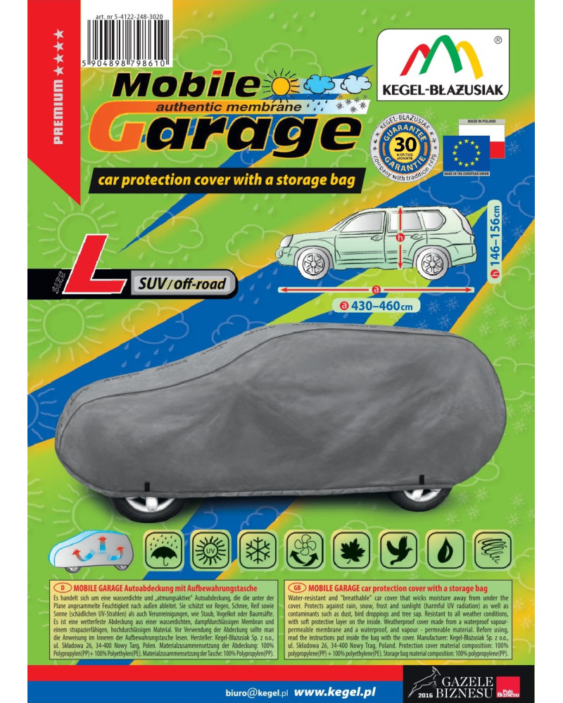 Wysokogatunkowy pokrowiec Mobile Garage to produkt dopasowany do potrzeb kierowców. Pokrowiec wykonany jest z aż 4-warstwowego materiału, który jest gruby, mocny i wytrzymały. Pokrowiec chroni cały samochód przed szkodliwym wpływem środowiska. Pokrowiec Mobile Garage to odpowiednia ochrona pojazdu przez cały rok. Jego funkcjonalność docenić można w każdej porze roku. W sezonie zimowym zapobiega osadzaniu się śniegu, szronu i lodu, a także jest odporny na przymarzanie; na jesieni chroni przed deszczem, wiatrem, liśćmi, sokami z drzew; zaś w porach letnich i wiosennych ochrania przed promieniami UV, pyłem i ptasimi odchodami.
