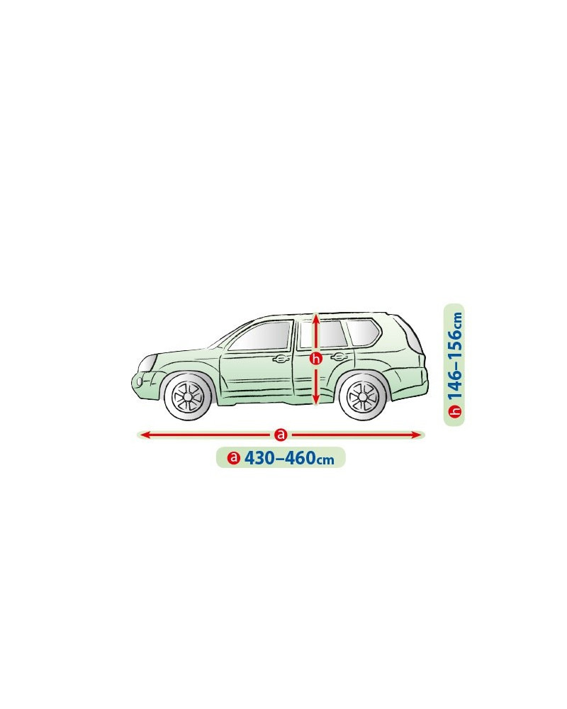 Materiał tekstylny, z którego wykonana jest plandeka dopasuje się zarówno do nieco mniejszego, jak i większego samochodu o podobnym kształcie i wymiarze nie przekraczającym podanego powyżej obwodu.