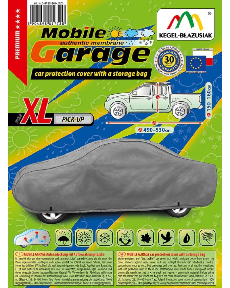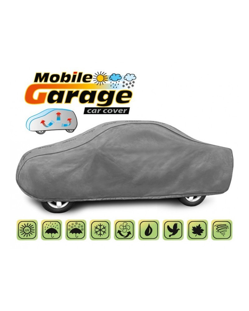 Wysokogatunkowy pokrowiec Mobile Garage to produkt dopasowany do potrzeb kierowców. Pokrowiec wykonany jest z aż 4-warstwowego materiału, który jest gruby, mocny i wytrzymały. Pokrowiec chroni cały samochód przed szkodliwym wpływem środowiska. Pokrowiec Mobile Garage to odpowiednia ochrona pojazdu przez cały rok. Jego funkcjonalność docenić można w każdej porze roku. W sezonie zimowym zapobiega osadzaniu się śniegu, szronu i lodu, a także jest odporny na przymarzanie; na jesieni chroni przed deszczem, wiatrem, liśćmi, sokami z drzew; zaś w porach letnich i wiosennych ochrania przed promieniami UV, pyłem i ptasimi odchodami.