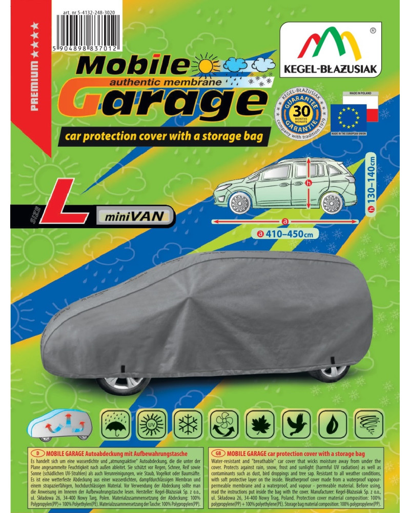 Wysokogatunkowy pokrowiec Mobile Garage to produkt dopasowany do potrzeb kierowców. Pokrowiec wykonany jest z aż 4-warstwowego materiału, który jest gruby, mocny i wytrzymały. Pokrowiec chroni cały samochód przed szkodliwym wpływem środowiska. Pokrowiec Mobile Garage to odpowiednia ochrona pojazdu przez cały rok. Jego funkcjonalność docenić można w każdej porze roku. W sezonie zimowym zapobiega osadzaniu się śniegu, szronu i lodu, a także jest odporny na przymarzanie; na jesieni chroni przed deszczem, wiatrem, liśćmi, sokami z drzew; zaś w porach letnich i wiosennych ochrania przed promieniami UV, pyłem i ptasimi odchodami.