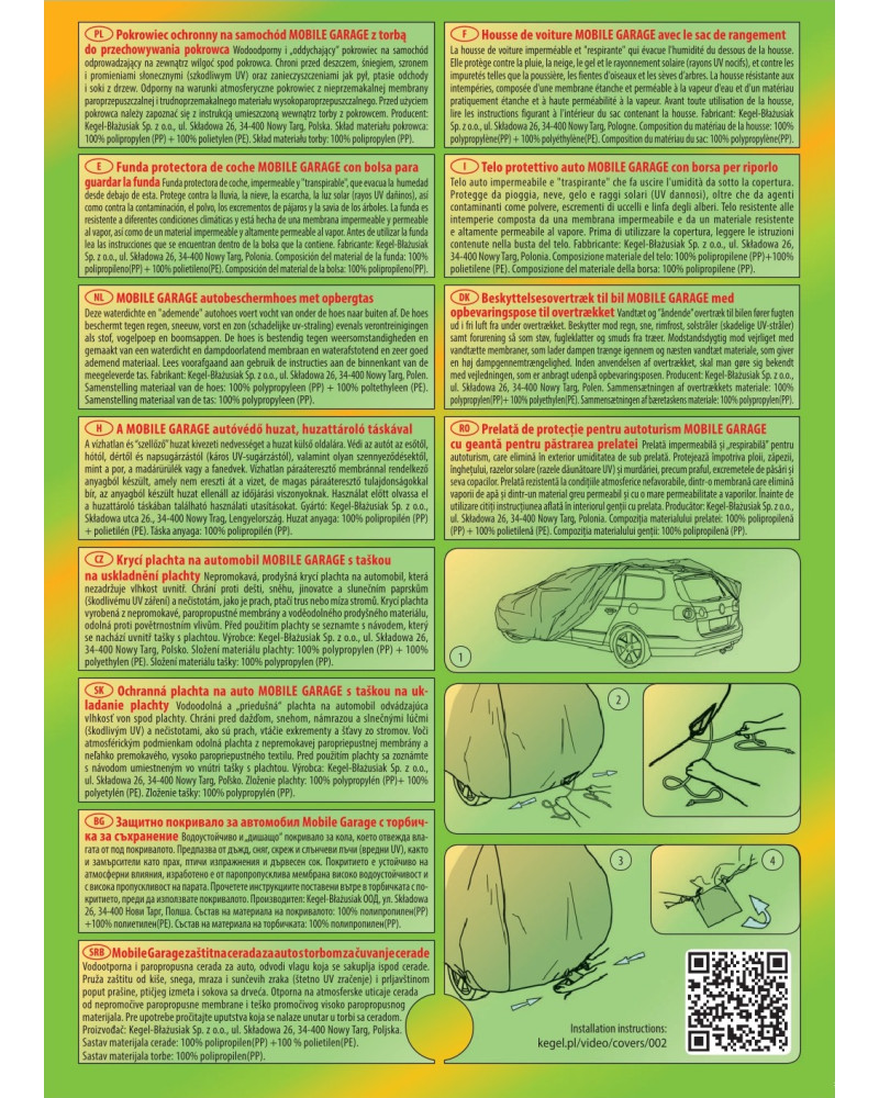 Wysokogatunkowy pokrowiec Mobile Garage to produkt dopasowany do potrzeb kierowców. Pokrowiec wykonany jest z aż 4-warstwowego materiału, który jest gruby, mocny i wytrzymały. Pokrowiec chroni cały samochód przed szkodliwym wpływem środowiska. Pokrowiec Mobile Garage to odpowiednia ochrona pojazdu przez cały rok. Jego funkcjonalność docenić można w każdej porze roku. W sezonie zimowym zapobiega osadzaniu się śniegu, szronu i lodu, a także jest odporny na przymarzanie; na jesieni chroni przed deszczem, wiatrem, liśćmi, sokami z drzew; zaś w porach letnich i wiosennych ochrania przed promieniami UV, pyłem i ptasimi odchodami.