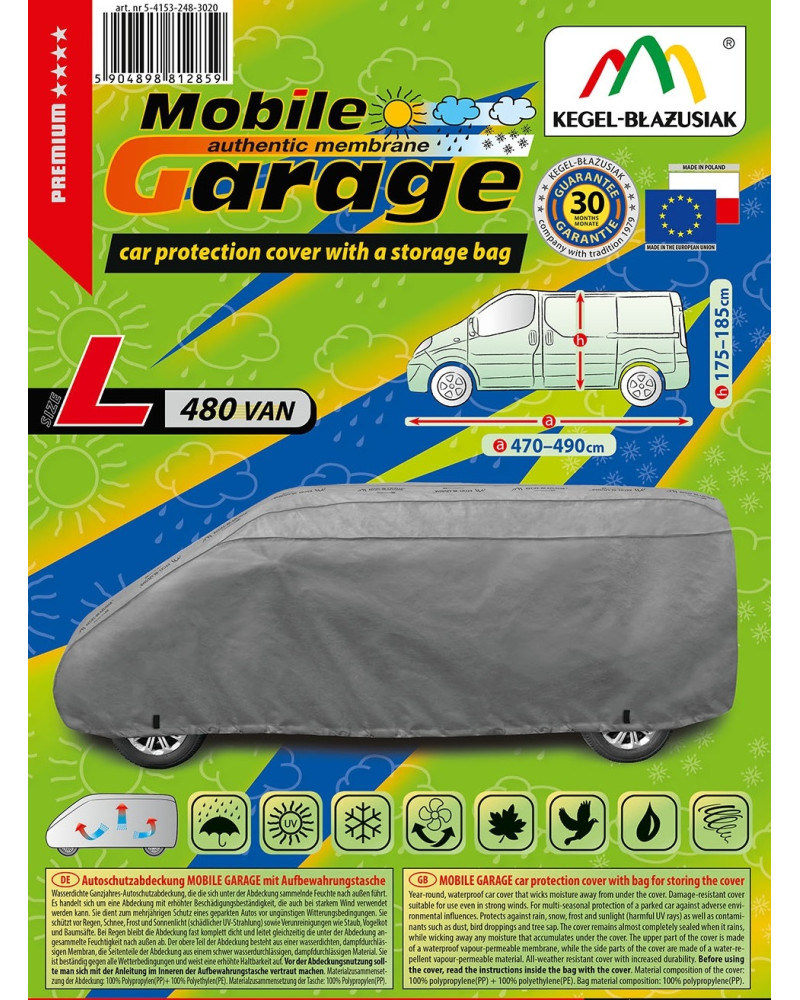 Wysokogatunkowy pokrowiec Mobile Garage to produkt dopasowany do potrzeb kierowców. Pokrowiec wykonany jest z aż 4-warstwowego materiału, który jest gruby, mocny i wytrzymały. Pokrowiec chroni cały samochód przed szkodliwym wpływem środowiska. Pokrowiec Mobile Garage to odpowiednia ochrona pojazdu przez cały rok. Jego funkcjonalność docenić można w każdej porze roku. W sezonie zimowym zapobiega osadzaniu się śniegu, szronu i lodu, a także jest odporny na przymarzanie; na jesieni chroni przed deszczem, wiatrem, liśćmi, sokami z drzew; zaś w porach letnich i wiosennych ochrania przed promieniami UV, pyłem i ptasimi odchodami.