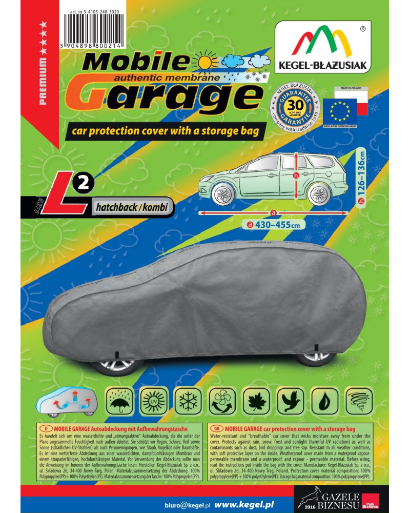 Wysokogatunkowy pokrowiec Mobile Garage to produkt dopasowany do potrzeb kierowców. Pokrowiec wykonany jest z aż 4-warstwowego materiału, który jest gruby, mocny i wytrzymały. Pokrowiec chroni cały samochód przed szkodliwym wpływem środowiska. Pokrowiec Mobile Garage to odpowiednia ochrona pojazdu przez cały rok. Jego funkcjonalność docenić można w każdej porze roku. W sezonie zimowym zapobiega osadzaniu się śniegu, szronu i lodu, a także jest odporny na przymarzanie; na jesieni chroni przed deszczem, wiatrem, liśćmi, sokami z drzew; zaś w porach letnich i wiosennych ochrania przed promieniami UV, pyłem i ptasimi odchodami.
