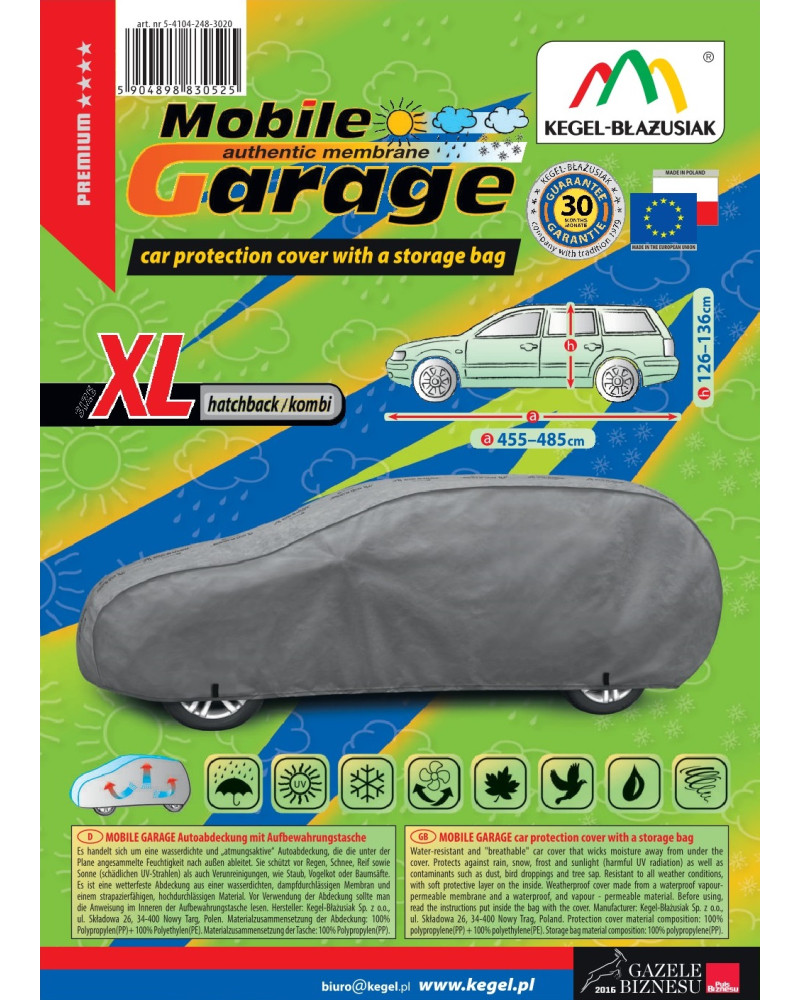 Wysokogatunkowy pokrowiec Mobile Garage to produkt dopasowany do potrzeb kierowców. Pokrowiec wykonany jest z aż 4-warstwowego materiału, który jest gruby, mocny i wytrzymały. Pokrowiec chroni cały samochód przed szkodliwym wpływem środowiska. Pokrowiec Mobile Garage to odpowiednia ochrona pojazdu przez cały rok. Jego funkcjonalność docenić można w każdej porze roku. W sezonie zimowym zapobiega osadzaniu się śniegu, szronu i lodu, a także jest odporny na przymarzanie; na jesieni chroni przed deszczem, wiatrem, liśćmi, sokami z drzew; zaś w porach letnich i wiosennych ochrania przed promieniami UV, pyłem i ptasimi odchodami.