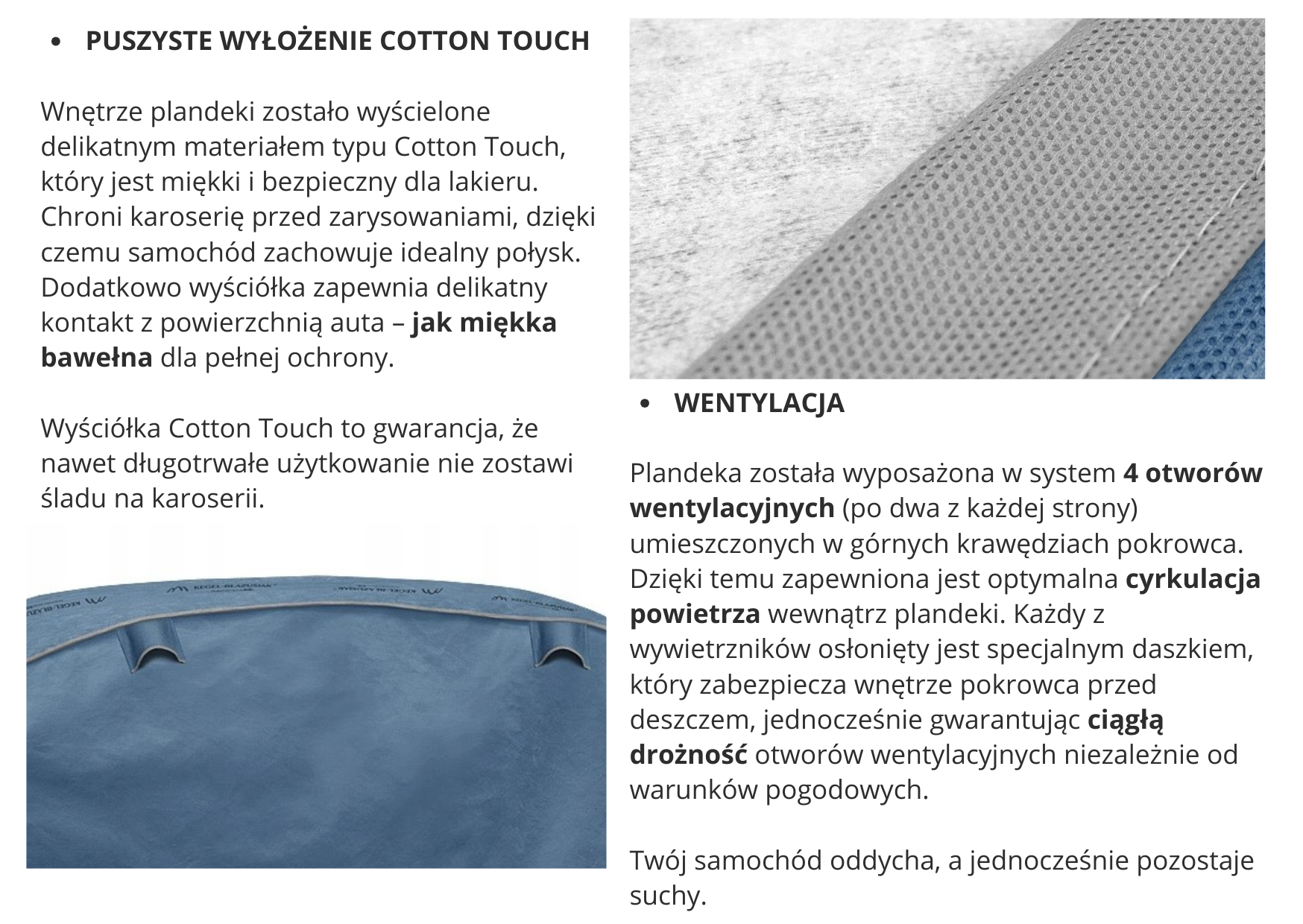 Niezwykłe właściwości wielowarstwowego materiału sprawiają, że pokrowiec nie przemaka, przy jednoczesnym odprowadzaniu pary wodnej spod pokrowca na zewnątrz. Każda oznaka wilgoci, która zgromadzi się pod pokrowcem szybko wyparuje, co pozwoli uniknąć rdzewieniu samochodu oraz powstawaniu pleśni. Pokrowiec przystosowany jest zarówno do doraźnego jak i długotrwałego stosowania. Pokrowiec można prać ręcznie w temperaturze 40 stopni. Pokrowiec ma kolor granatowy, który jest niezwykle praktyczny a zarazem świetnie się prezentuje. Przez środek pokrowca biegnie napis przedstawiający nazwę producenta i logo firmy oraz nazwę materiału z którego został zrobiony- da Ci to gwarancję oryginalności i wysokiej jakości produktu. Różnorodność kształtów i rozmiarów sprawia, że możesz wybrać pokrowiec, który dobrze dopasuje się do Twojego samochodu.