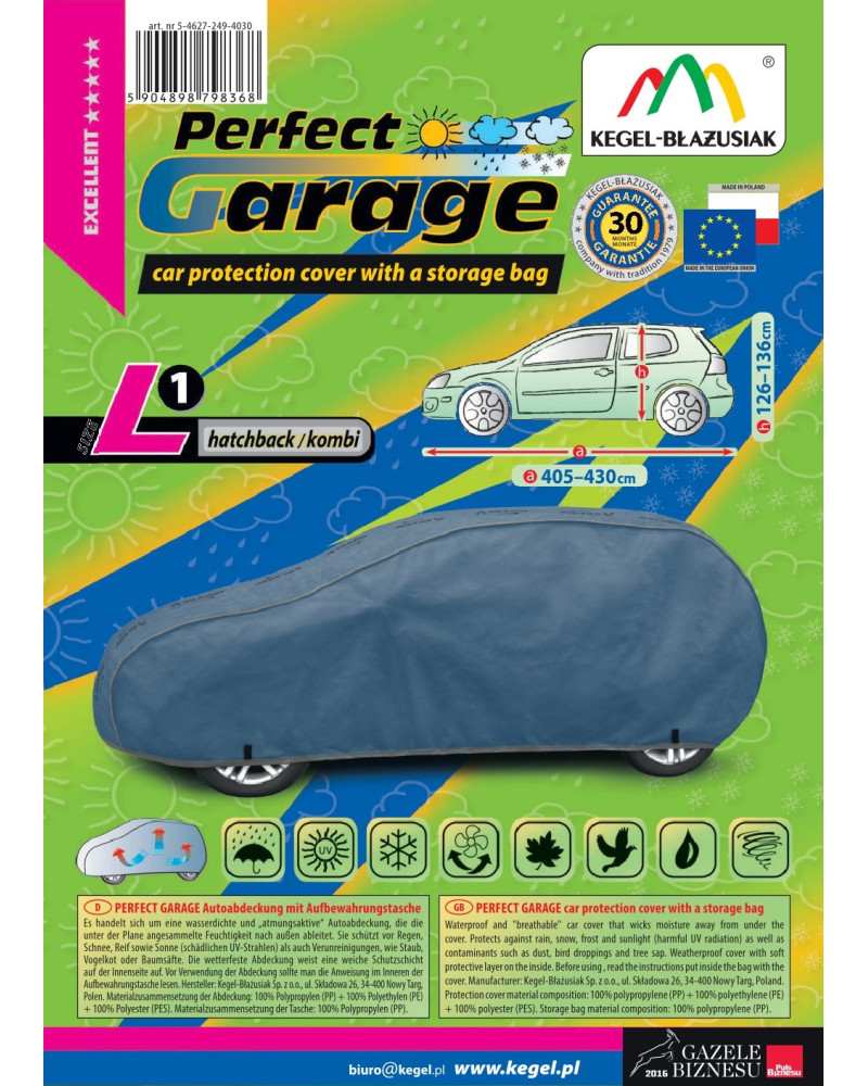 Wysokiej klasy pokrowiec PERFECT GARAGE - nieprzemakalny i paroprzepuszczalny. Produkowany w Polsce, głównie z polskich surowców z zachowaniem wszystkich standardów jakościowych Unii Europejskiej. Lata doświadczenia i coraz bardziej doskonały asortyment sprawia, że pokrowce tejże firmy KEGEL-BŁAŻUSIAK można określić mianem najlepszych w Polsce. Produkt z serii PERFECT GARAGE, której hasłem przewodnim jest- bardzo dobra jakość.