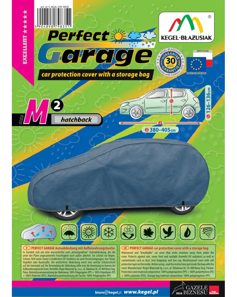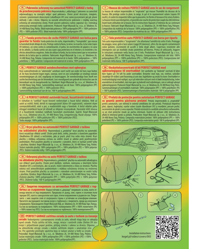 Wysokiej klasy pokrowiec PERFECT GARAGE - nieprzemakalny i paroprzepuszczalny. Produkowany w Polsce, głównie z polskich surowców z zachowaniem wszystkich standardów jakościowych Unii Europejskiej. Lata doświadczenia i coraz bardziej doskonały asortyment sprawia, że pokrowce tejże firmy KEGEL-BŁAŻUSIAK można określić mianem najlepszych w Polsce. Produkt z serii PERFECT GARAGE, której hasłem przewodnim jest- bardzo dobra jakość.