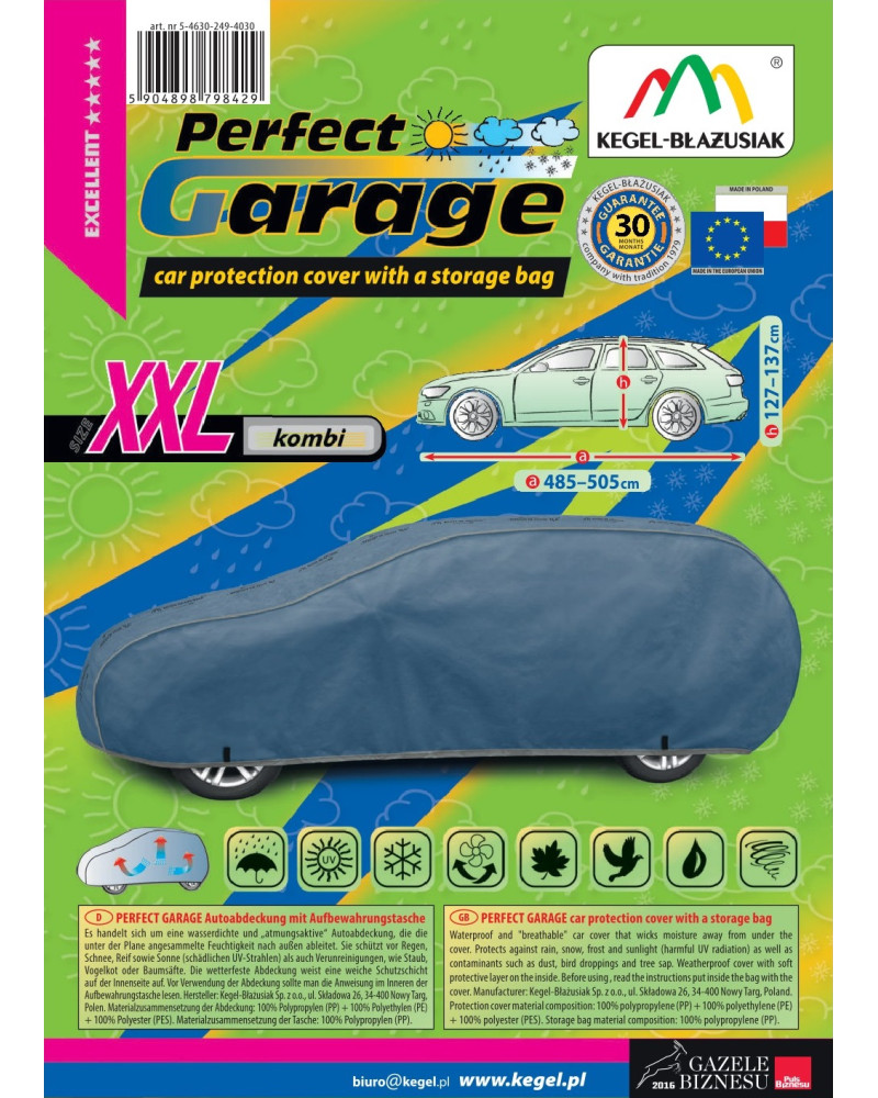 Wysokiej klasy pokrowiec PERFECT GARAGE - nieprzemakalny i paroprzepuszczalny. Produkowany w Polsce, głównie z polskich surowców z zachowaniem wszystkich standardów jakościowych Unii Europejskiej. Lata doświadczenia i coraz bardziej doskonały asortyment sprawia, że pokrowce tejże firmy KEGEL-BŁAŻUSIAK można określić mianem najlepszych w Polsce. Produkt z serii PERFECT GARAGE, której hasłem przewodnim jest- bardzo dobra jakość.