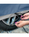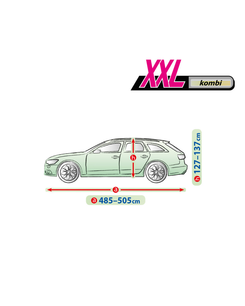 Na etykiecie zewnętrznej pokrowca znajduje się oznaczenie rozmiaru wraz z rysunkiem przedstawiającym kształt i wymiary samochodu na który przeznaczony jest pokrowiec. Proszę sprawdzić czy dokonali Państwo zakupu pokrowca w odpowiednim rozmiarze na samochód na którym będzie użytkowany. Dobrze dopasowany pokrowiec z mocno zaciągniętą i zawiązaną linką ściągacza można bezpiecznie użytkować nawet podczas silnego wiatru. Jeżeli pokrowiec będzie użytkowany podczas bardzo silnego wiatru, pokrowiec można dodatkowo przymocować do kół samochodu za pętle wszyte w dolną krawędź pokrowca.