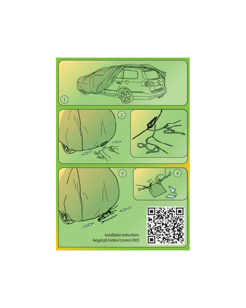 Przed założeniem pokrowca na samochód złożyć boczne lusterka oraz złożyć lub odkręcić antenę. Pokrowiec założyć na czysty i suchy samochód stroną z nadrukiem na zewnątrz. Dla ułatwienia prawidłowego ułożenia pokrowca na samochodzie w pokrowiec wszyta jest wszywka FRONT z przodu pokrowca i REAR z tyłu pokrowca (oznaczenie pokrywają się z przodem i tyłem samochodu).