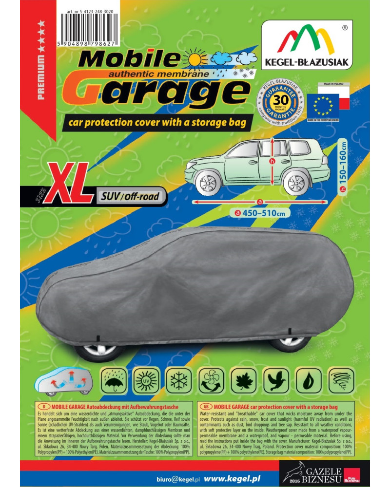 Wysokogatunkowy pokrowiec Mobile Garage to produkt dopasowany do potrzeb kierowców. Pokrowiec wykonany jest z aż 4-warstwowego materiału, który jest gruby, mocny i wytrzymały. Pokrowiec chroni cały samochód przed szkodliwym wpływem środowiska. Pokrowiec Mobile Garage to odpowiednia ochrona pojazdu przez cały rok. Jego funkcjonalność docenić można w każdej porze roku. W sezonie zimowym zapobiega osadzaniu się śniegu, szronu i lodu, a także jest odporny na przymarzanie; na jesieni chroni przed deszczem, wiatrem, liśćmi, sokami z drzew; zaś w porach letnich i wiosennych ochrania przed promieniami UV, pyłem i ptasimi odchodami.
