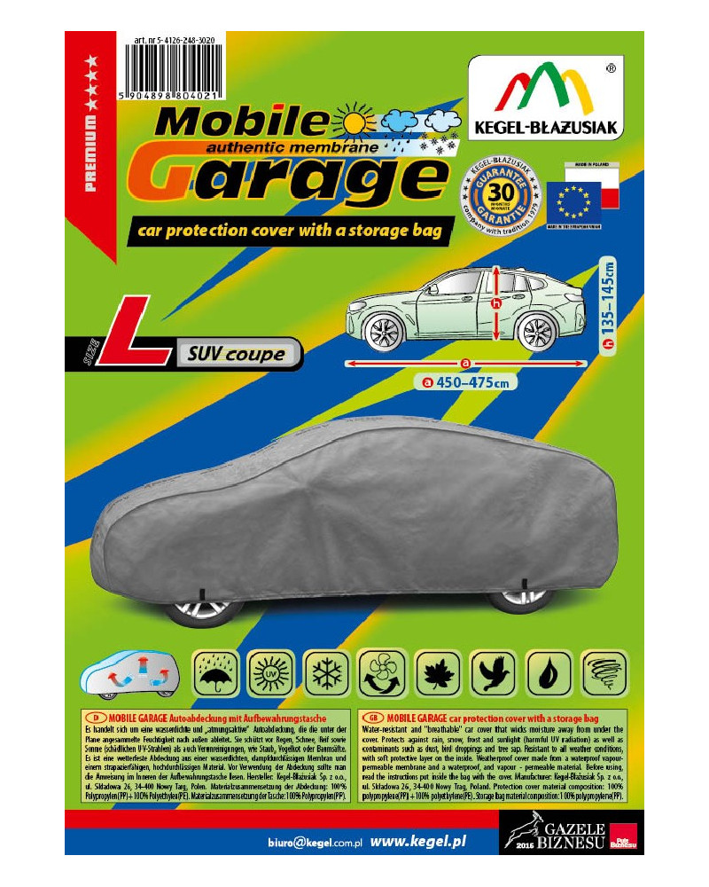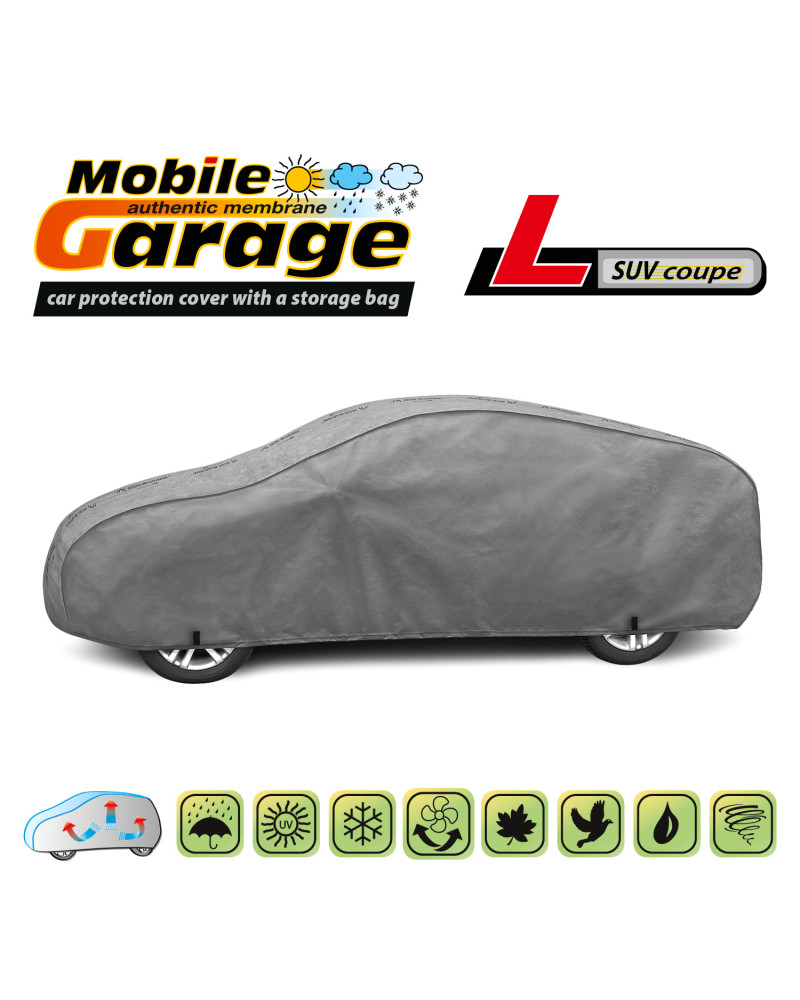 Wysokogatunkowy pokrowiec Mobile Garage to produkt dopasowany do potrzeb kierowców. Pokrowiec wykonany jest z aż 4-warstwowego materiału, który jest gruby, mocny i wytrzymały. Pokrowiec chroni cały samochód przed szkodliwym wpływem środowiska. Pokrowiec Mobile Garage to odpowiednia ochrona pojazdu przez cały rok. Jego funkcjonalność docenić można w każdej porze roku. W sezonie zimowym zapobiega osadzaniu się śniegu, szronu i lodu, a także jest odporny na przymarzanie; na jesieni chroni przed deszczem, wiatrem, liśćmi, sokami z drzew; zaś w porach letnich i wiosennych ochrania przed promieniami UV, pyłem i ptasimi odchodami.
