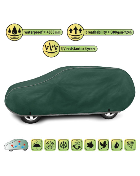 Niezwykłe właściwości wielowarstwowego materiału sprawiają, że pokrowiec nie przemaka, przy jednoczesnym odprowadzaniu pary wodnej spod pokrowca na zewnątrz. Każda oznaka wilgoci, która zgromadzi się pod pokrowcem szybko wyparuje, co pozwoli uniknąć rdzewieniu samochodu oraz powstawaniu pleśni. Pokrowiec przystosowany jest zarówno do doraźnego jak i długotrwałego stosowania.
