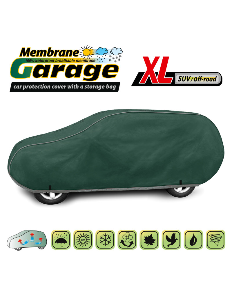 Wysokogatunkowy pokrowiec Membrane Garage to produkt dopasowany do potrzeb kierowców. Pokrowiec wykonany jest w całości aż z 4-warstwowego materiału, który jest gruby, mocny i wytrzymały. Pokrowiec chroni cały samochód przed szkodliwym wpływem środowiska. Pokrowiec Membrane Garage to odpowiednia ochrona pojazdu przez cały rok. Jego funkcjonalność docenić można w każdej porze roku. W sezonie zimowym zapobiega osadzaniu się śniegu, szronu i lodu, a także jest odporny na przymarzanie; na jesieni chroni przed deszczem, wiatrem, liśćmi, sokami z drzew; zaś w porach letnich i wiosennych ochrania przed promieniami UV, pyłem i ptasimi odchodami.