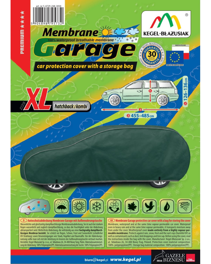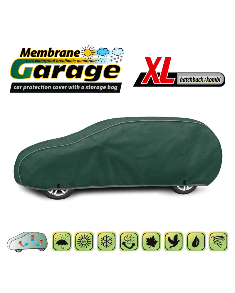 Wysokogatunkowy pokrowiec Membrane Garage to produkt dopasowany do potrzeb kierowców. Pokrowiec wykonany jest w całości aż z 4-warstwowego materiału, który jest gruby, mocny i wytrzymały. Pokrowiec chroni cały samochód przed szkodliwym wpływem środowiska. Pokrowiec Membrane Garage to odpowiednia ochrona pojazdu przez cały rok. Jego funkcjonalność docenić można w każdej porze roku. W sezonie zimowym zapobiega osadzaniu się śniegu, szronu i lodu, a także jest odporny na przymarzanie; na jesieni chroni przed deszczem, wiatrem, liśćmi, sokami z drzew; zaś w porach letnich i wiosennych ochrania przed promieniami UV, pyłem i ptasimi odchodami.