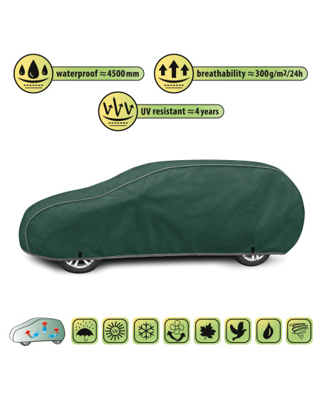 Niezwykłe właściwości wielowarstwowego materiału sprawiają, że pokrowiec nie przemaka, przy jednoczesnym odprowadzaniu pary wodnej spod pokrowca na zewnątrz. Każda oznaka wilgoci, która zgromadzi się pod pokrowcem szybko wyparuje, co pozwoli uniknąć rdzewieniu samochodu oraz powstawaniu pleśni. Pokrowiec przystosowany jest zarówno do doraźnego jak i długotrwałego stosowania.