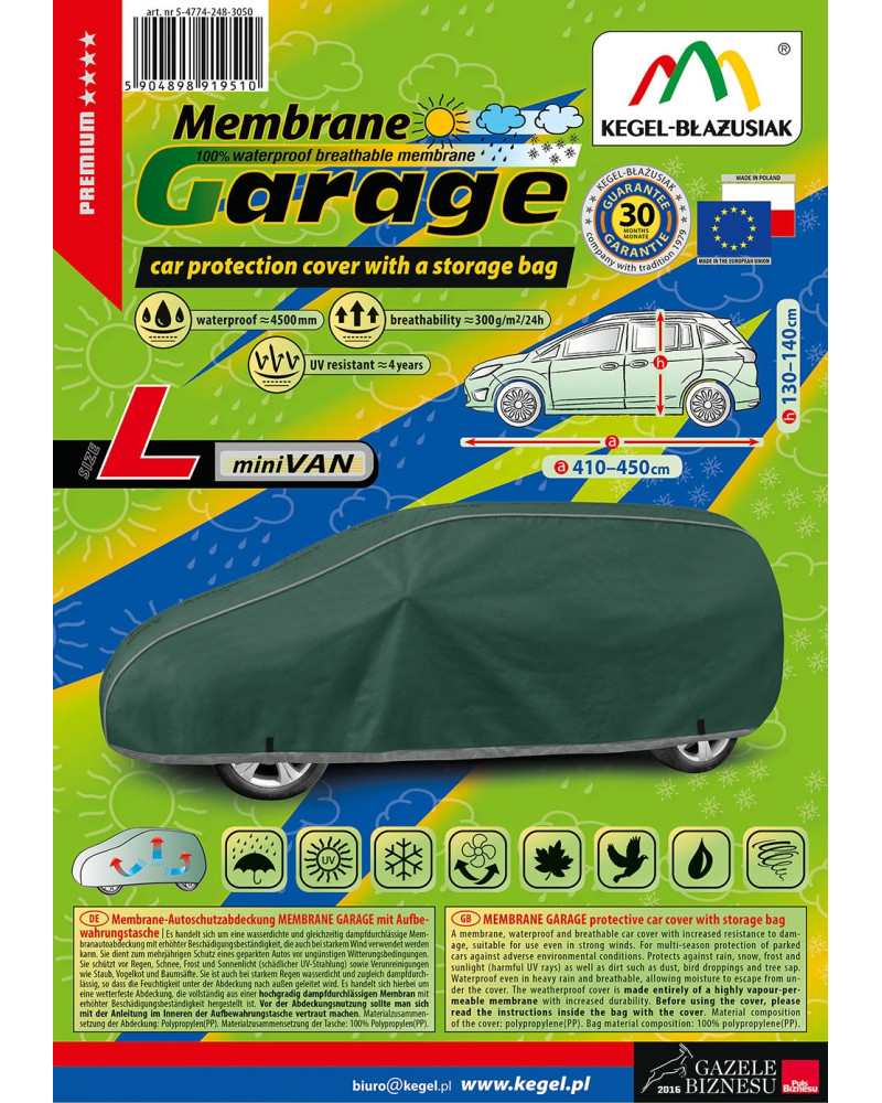 Wysokogatunkowy pokrowiec Membrane Garage to produkt dopasowany do potrzeb kierowców. Pokrowiec wykonany jest w całości aż z 4-warstwowego materiału, który jest gruby, mocny i wytrzymały. Pokrowiec chroni cały samochód przed szkodliwym wpływem środowiska. Pokrowiec Membrane Garage to odpowiednia ochrona pojazdu przez cały rok. Jego funkcjonalność docenić można w każdej porze roku. W sezonie zimowym zapobiega osadzaniu się śniegu, szronu i lodu, a także jest odporny na przymarzanie; na jesieni chroni przed deszczem, wiatrem, liśćmi, sokami z drzew; zaś w porach letnich i wiosennych ochrania przed promieniami UV, pyłem i ptasimi odchodami.