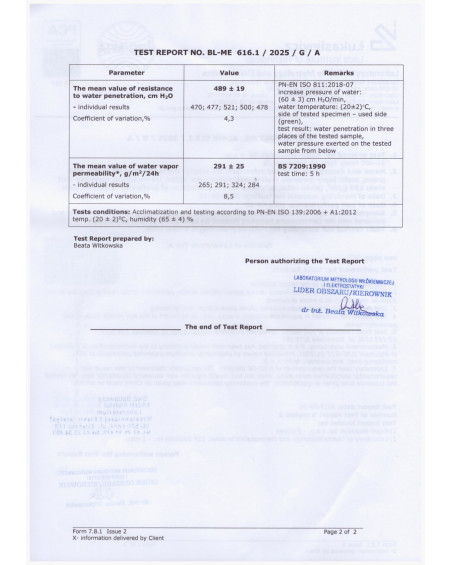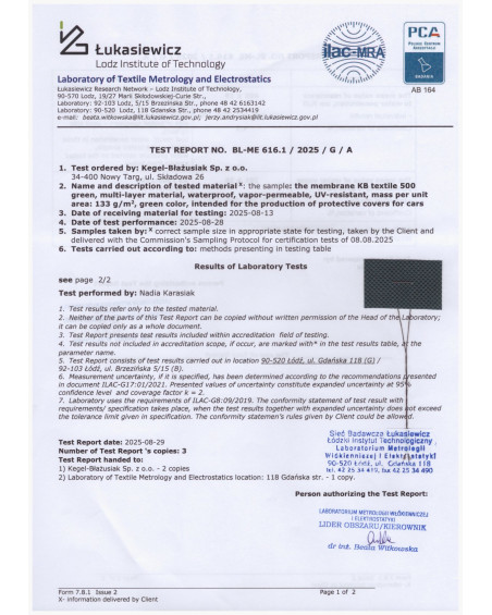 Poniżej raport z badań paroprzepuszczalności membrany z której produkujemy pokrowce Membrana Garage. Badanie potwierdza wysoką paroprzepuszczalność i wodoszczelność membrany: przenikanie pary wodnej przez membranę pokrowca 291 gramów pary wodnej przez m² membrany w ciągu 24 godzin, wodoszczelność membrany 4890 mm słupa wody.