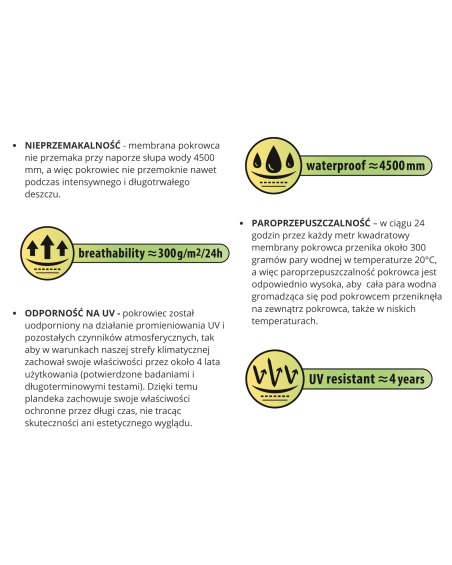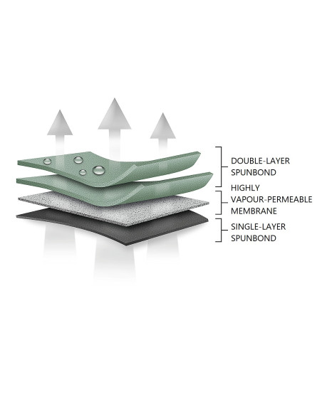 Niezwykłe właściwości wielowarstwowego materiału sprawiają, że pokrowiec nie przemaka, przy jednoczesnym odprowadzaniu pary wodnej spod pokrowca na zewnątrz. Każda oznaka wilgoci, która zgromadzi się pod pokrowcem szybko wyparuje, co pozwoli uniknąć rdzewieniu samochodu oraz powstawaniu pleśni. Pokrowiec przystosowany jest zarówno do doraźnego jak i długotrwałego stosowania.