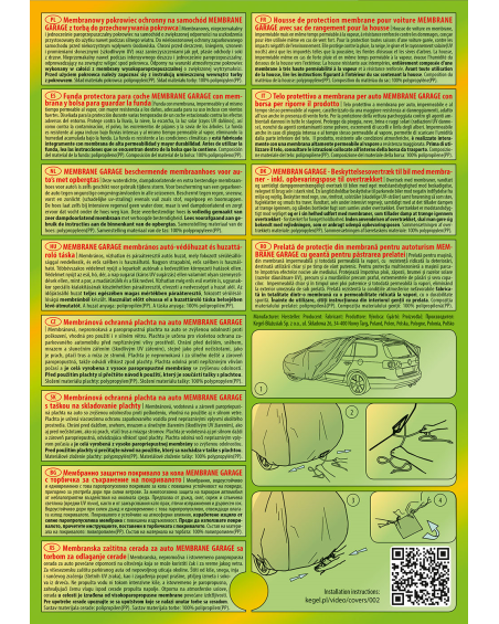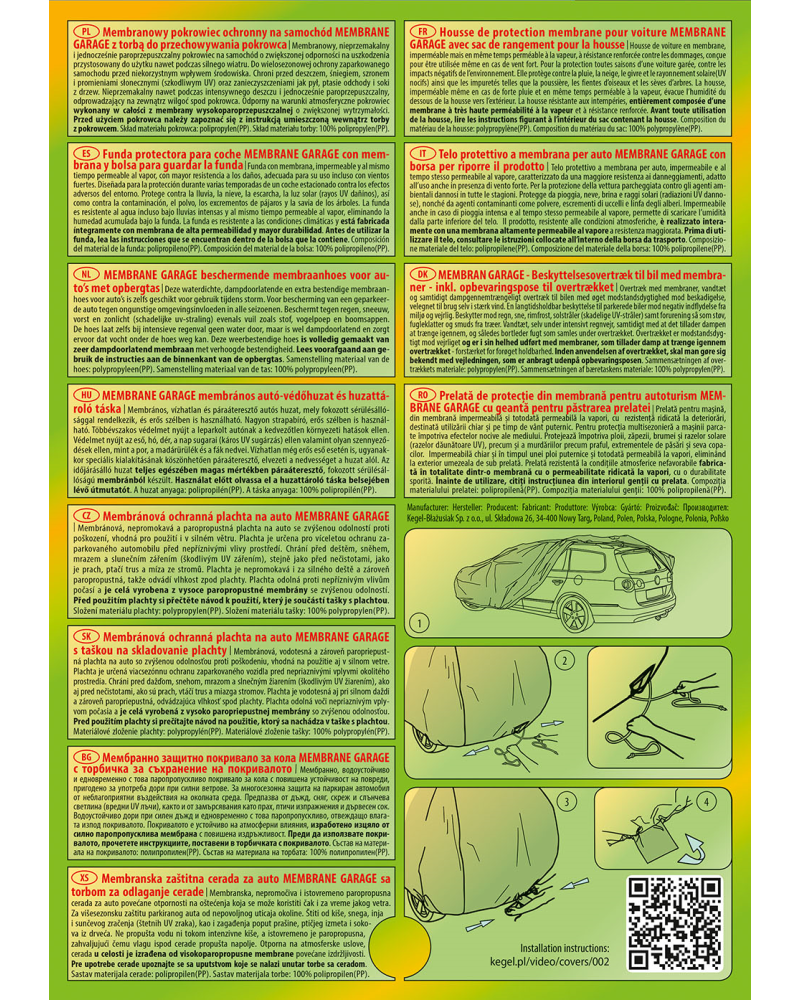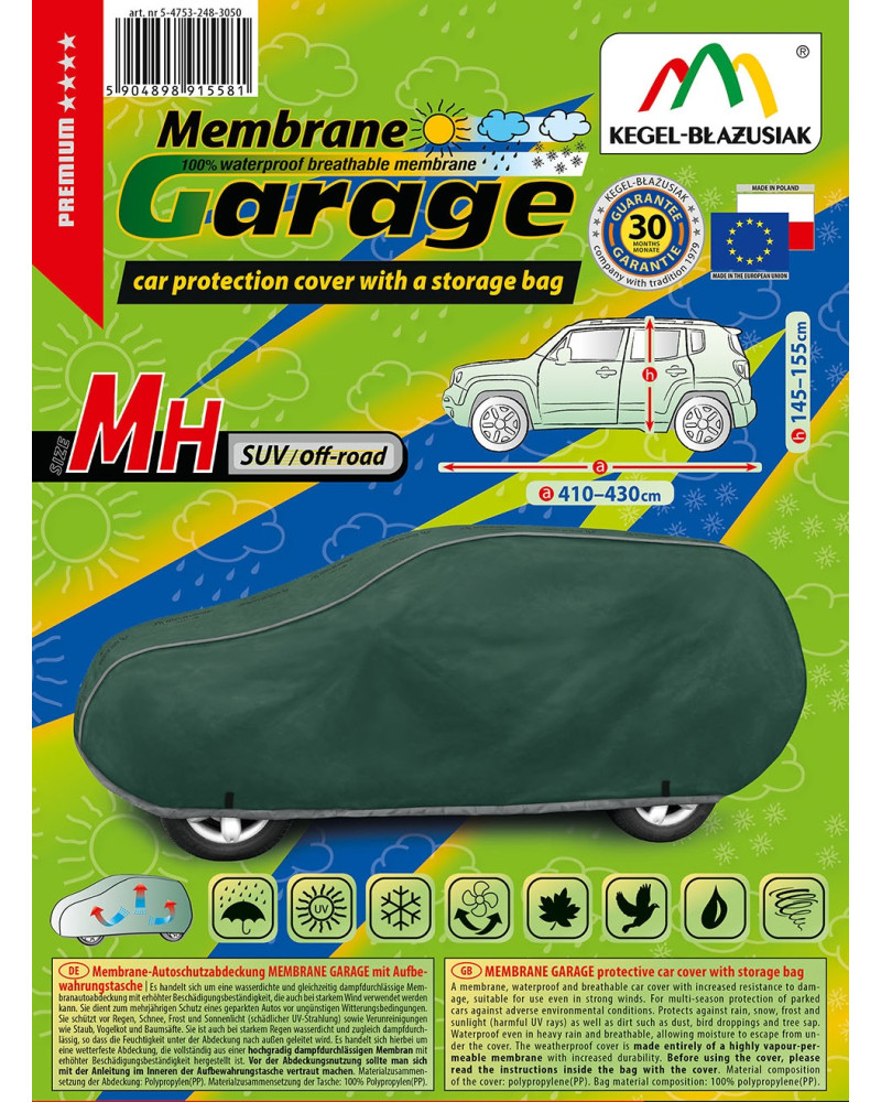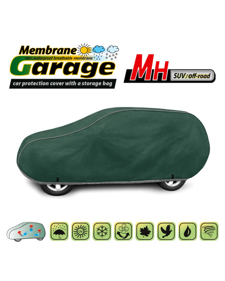 Wysokogatunkowy pokrowiec Membrane Garage to produkt dopasowany do potrzeb kierowców. Pokrowiec wykonany jest w całości aż z 4-warstwowego materiału, który jest gruby, mocny i wytrzymały. Pokrowiec chroni cały samochód przed szkodliwym wpływem środowiska. Pokrowiec Membrane Garage to odpowiednia ochrona pojazdu przez cały rok. Jego funkcjonalność docenić można w każdej porze roku. W sezonie zimowym zapobiega osadzaniu się śniegu, szronu i lodu, a także jest odporny na przymarzanie; na jesieni chroni przed deszczem, wiatrem, liśćmi, sokami z drzew; zaś w porach letnich i wiosennych ochrania przed promieniami UV, pyłem i ptasimi odchodami.