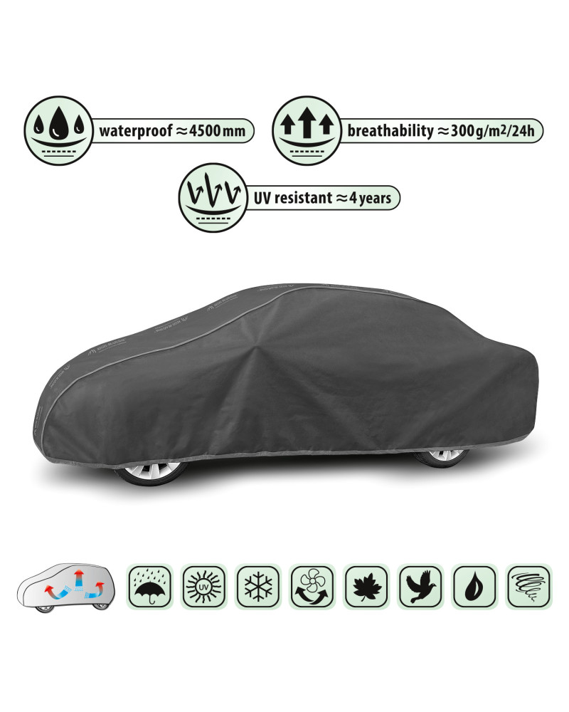 Membranowy, nieprzemakalny i jednocześnie paroprzepuszczalny pokrowiec na samochód. Nieprzemakalny nawet podczas intensywnego deszczu i jednocześnie paroprzepuszczalny, odprowadzający na zewnątrz wilgoć spod pokrowca. Odporny na warunki atmosferyczne pokrowiec wykonany w całości z membrany wysokoparoprzepuszczalnej. Chroni przed deszczem, śniegiem, szronem i promieniami słonecznymi (szkodliwym UV) oraz zanieczyszczeniami jak pył, ptasie odchody i soki z drzew.