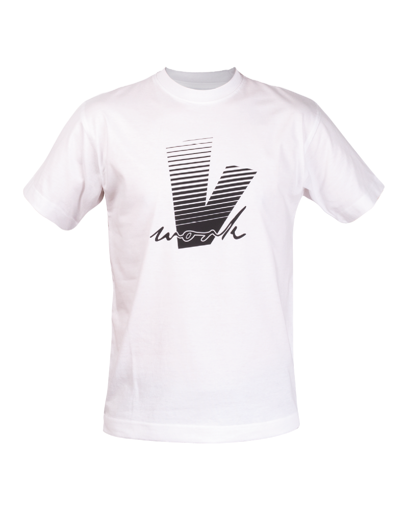 Biały T-shirt z czarnym nadrukiem V-Work jest uszyty do codziennego noszenia. Uniwersalna koszulka z krótkim rękawem z dzianiny łączącej poliester z bawełną gwarantuję długotrwałe zachowanie koloru po wielu praniach, komfort podczas noszenia i wytrzymałość na dłuższy czas użytkowania.